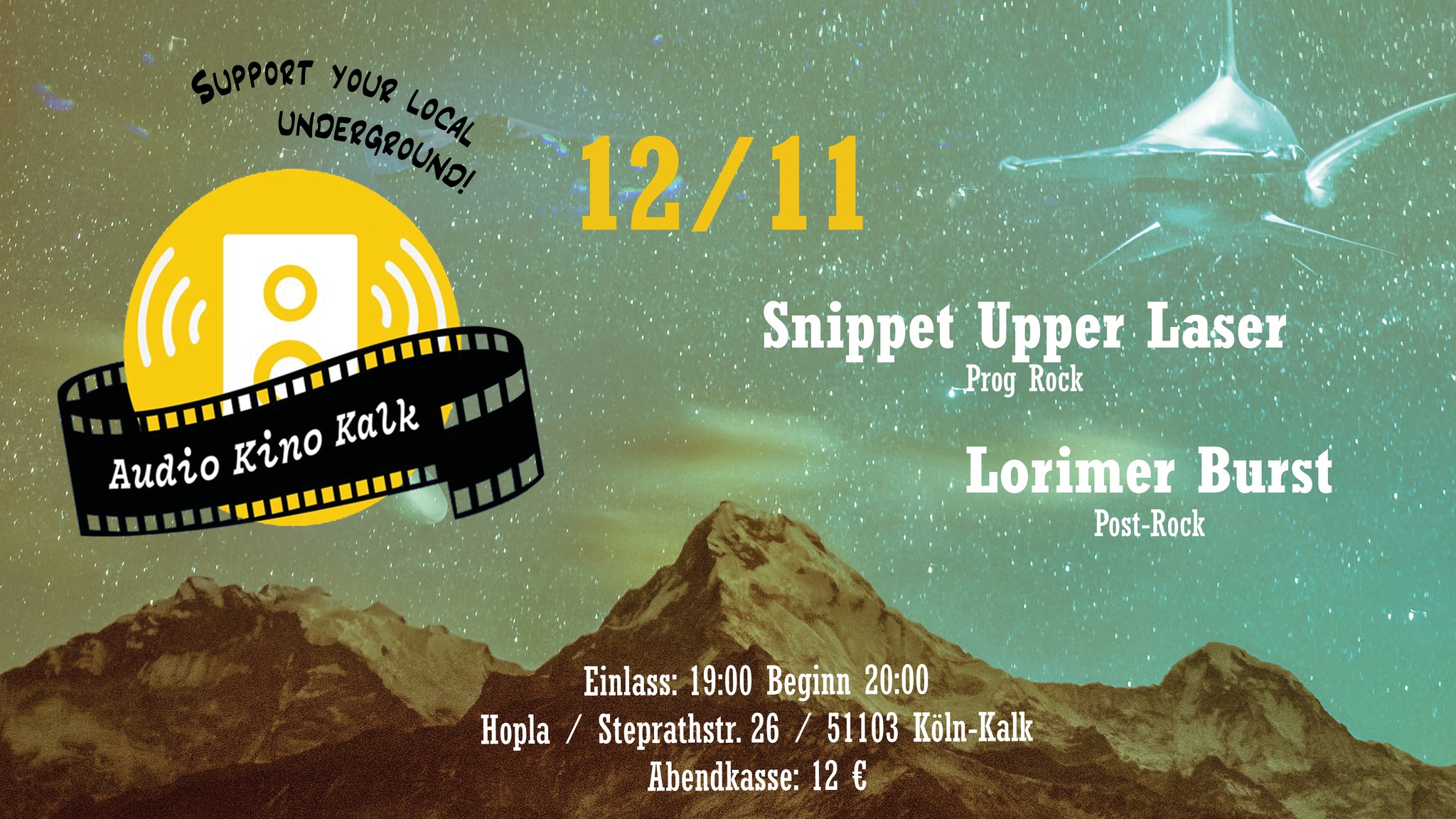 Das habe ich der Einladung von Snippet Upper Laser zu verdanken, die uns schon vor geraumer Zeit eingeladen hatten, von einer ihrer Shows zu berichten. Heute hat’s endlich geklappt, und ich freue mich sehr drauf, die Jungs wiederzusehen. Ebenfalls am Start sind Lorimer Burst.