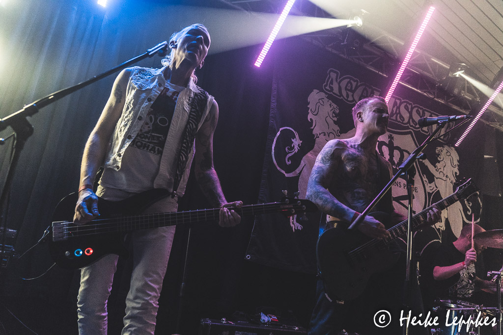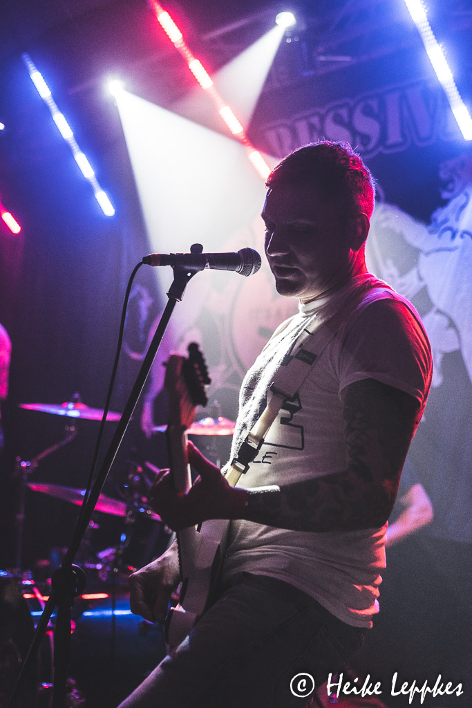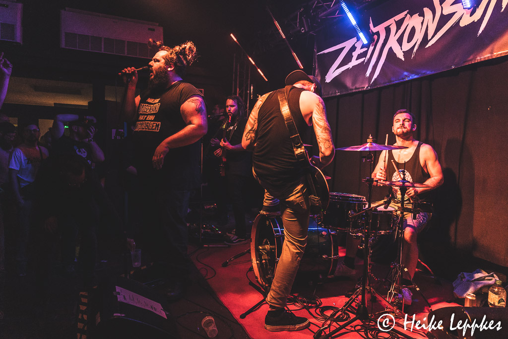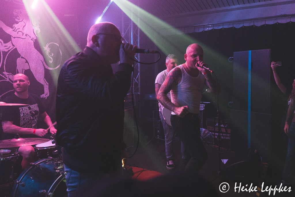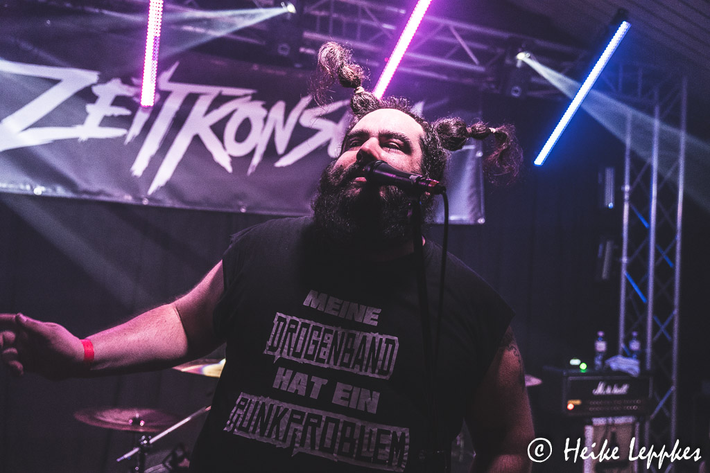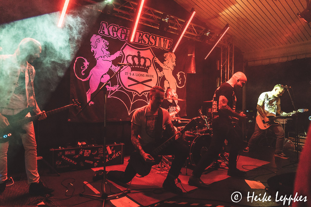 Das ändert sich schlagartig bei Aggressive aus Düsseldorf. Die gibt es seit dem Jahr 2013, und sie bringen sehr geilen Oldschool HCPunk / Oi! mit. Da ist vor der Bühne streckenweise die Hölle los, und ein Mal kann ich mich auch nicht schnell genug in Sicherheit bringen. Da finde ich mich dann in Nullkommanix fünf Meter weiter wieder und werde postwendend zurück in den Pit geschubst. Dem kann ich aber entgehen und gebe mir die sehr energiegeladene Show dann aus sicherer Entfernung. Sänger Dan hat da weniger Berührungsängste und tigert oft vor der Bühne hin und her. Bei ihren Alben haben Aggressive so etwas wie einen Drei-Jahres-Rhythmus entwickelt. Nach Spit Blood aus 2015 und Stick Together aus 2018 erschien in diesem Jahr das neue Album Unbreakable. Das ist auf der Setliste von Aggressive auch mit Songs wie Protect, Carry On, Better Days oder Times gut vertreten. Bei Genauso Wie Wir gesellt sich dann ein Urgestein der Punkszene mit auf die Bühne, nämlich Zoni von Verlorene Jungs. Da gibt’s dann vor der Bühne kein Halten mehr, lautstarkes gemeinsames Absingen ist angesagt. Eine schlechte Nachricht hatten Aggressive ja bereits verkündet. Einer der beiden Gitarristen, nämlich Conzi, verlässt aus beruflichen Gründen nach sechs Jahren die Band. Eine kleine Rede hält Conzi dann auch noch, aber man merkt ihm an, dass er sich normalerweise lieber im Hintergrund hält. 😀 Mit Overdose ist dann der letzte Song der Setliste gespielt, und der Zeitplan steht erstaunlicherweise noch. So können also ZeitKonsum in Ruhe umbauen.