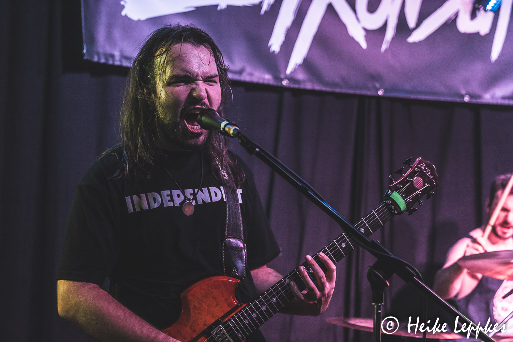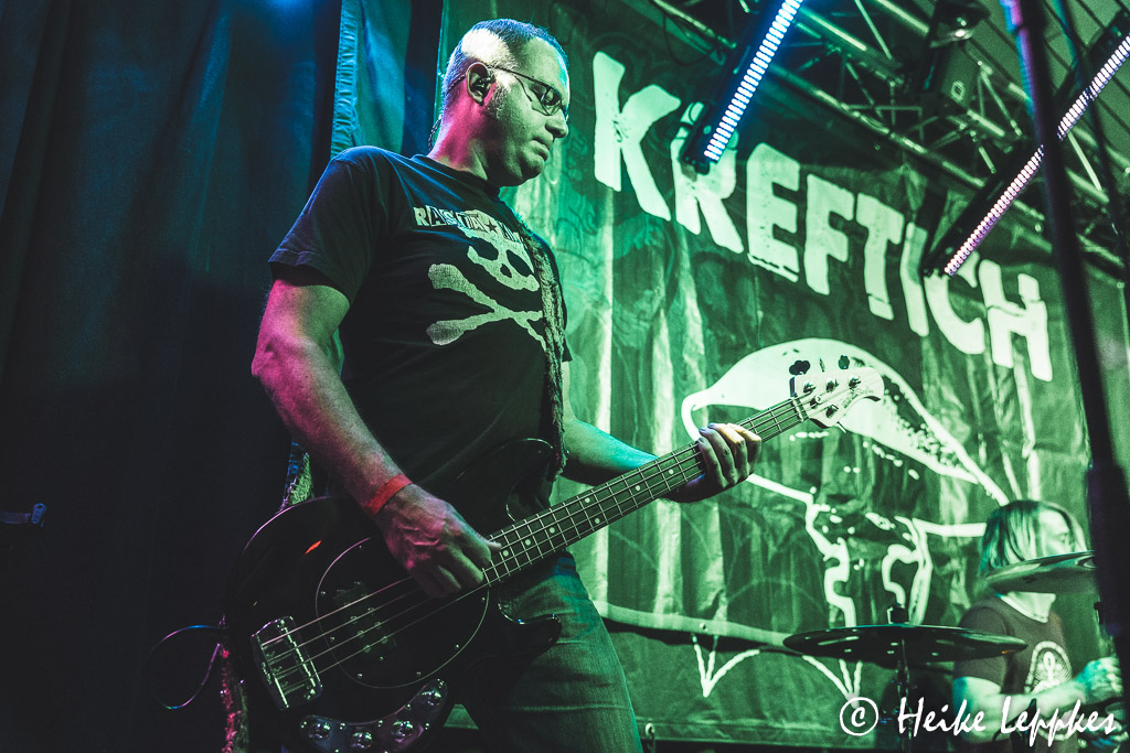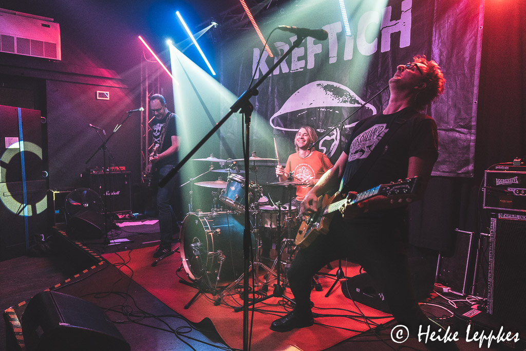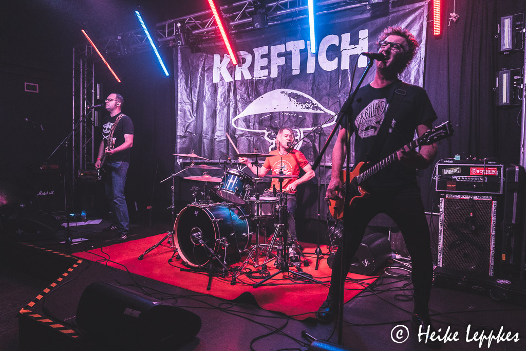 Drei Bands sind heute am Start, den Auftakt macht Kreftich. Die Band wurde bereits im Jahr 1996 in Dinslaken gegründet, und wenn ich es im Internet richtig gelesen habe, ist das Trio nach wie vor mit den drei Gründungsmitgliedern Flo, Lasse und Hagi besetzt. Nach den Alben Stillos! aus 2007 und Bis Hierhin Und Dann Weiter aus 2011 ist niemals stumm aus 2018 bislang das letzte Album. Begrüßt werden wir mit den Worten „Hallo Duisburg!“, aber im Laufe der Show wird in den Ansagen aus „Duisburg“ auch gern mal „Oberhausen“, und tatsächlich fällt auch mal der Name „Essen“ 😀 Neben sehr witzigen Dialogen haben die Männer aber natürlich auch Musik dabei und können mit Songs wie Der Berg Ruft, Notruf, Orkan oder Gegenwind die Anwesenden schon mal auf Betriebstemperatur bringen. Da treten dann auch die ersten Moshwütigen auf den Plan, aber es hält sich noch im Rahmen.