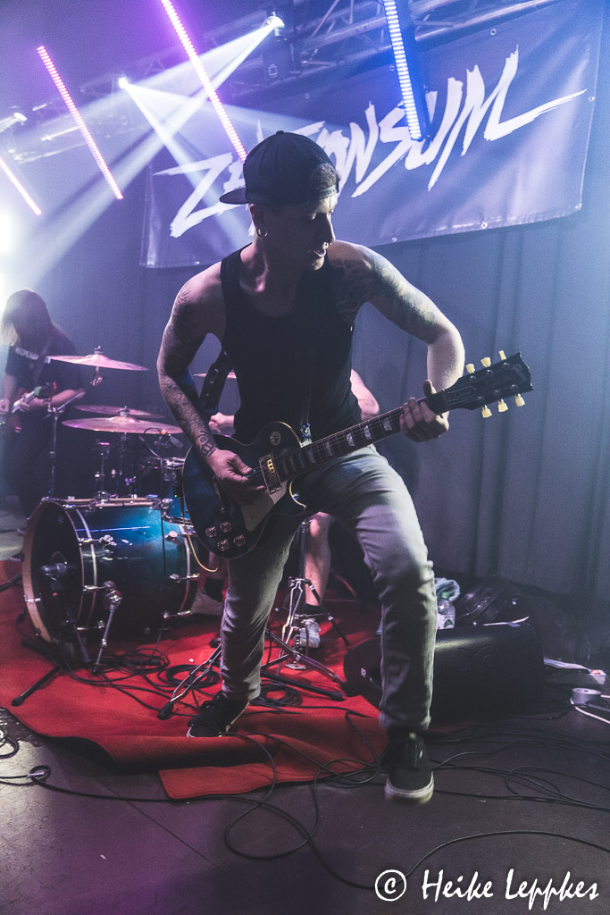 Vor der Show kommt Matthias dann noch zu mir und drückt mir einen Ausdruck der Setliste in die Hand. Die ist vorbildlich beschriftet mit Bandname, Datum und Ort der Veranstaltung. Er hatte nämlich mitbekommen, dass ich bei den vielen Setlisten, die ich während der Osterather Pestspiele mit dem Handy fotografiert hatte, durcheinanderkam, weil da meistens nur die Songs draufstanden. 😀 Vor einer knappen Woche war Releaseday fürs Debütalbum Zukunftsmusik, und man sieht den Jungs schon an, dass sie – berechtigterweise – mächtig stolz auf die Scheibe sind (unser Review zu der Scheibe folgt noch). Aber zwischen den Songs vom Album, wie Ich Will Die 7 Sein, Gitarrenlehrling, Arte oder Ihren Ex gibt es auch noch Platz für ältere Tracks. Das Fickt Dich Dann So oder Mach Es Schnell fügen sich aber natürlich problemlos in die Reihe ein. Vier der Bandmitglieder verlassen ihre Plätze nicht, nur Patrik hält es mal wieder nicht auf der Stelle. Schon bei Shows der Metalcoreband Beginning, die sich ja leider vor längerem aufgelöst hat, war er mit seinem wahnwitzigen Bewegungsdrang auf den meisten meiner Fotos. Und auch heute nutzt er den ihm zur Verfügung stehenden Platz bis auf den letzten Zentimeter aus. Ein Ausflug vor die Bühne mitten rein ins Publikum endet zwar mit einem Sturz auf dem mit Bierlachen überfluteten Boden, aber selbst im Liegen spielt er weiter. Wie es in der Szene üblich ist, finden sich sofort helfende Hände, die ihm wieder aufhelfen, und vollkommen unbeeindruckt stürzt Patrik sich sofort wieder rein in die Meute vor der Bühne. Großartig! 😀 Dann ist mit Radio auch schon der letzte Song auf der Setliste gespielt. Der hatte am 20.08. seine Videopremiere auf dem YouTube-Channel von Hardcore Worldwide und bringt das Autumnpunk heute pünktlichst zum Ende. Mit Blick auf die Uhr müssen ZeitKonsum die „Zugabe“-Rufe mit einem Kopfschütteln beantworten. Aber als die Jungs schweißüberströmt von der Bühne kommen, sieht man ihnen allen an, wie sehr sie diesen Auftritt heute genossen haben. Aber nicht nur bei den Jungs ist heute der Schweiß geflossen. Da es im Café Nova sowieso ziemlich warm ist, zieht es nicht nur mich ziemlich zügig erstmal nach draußen.