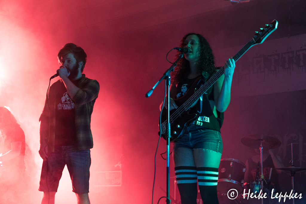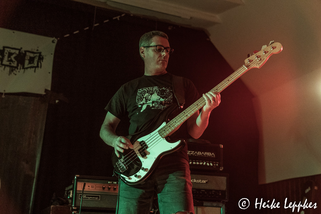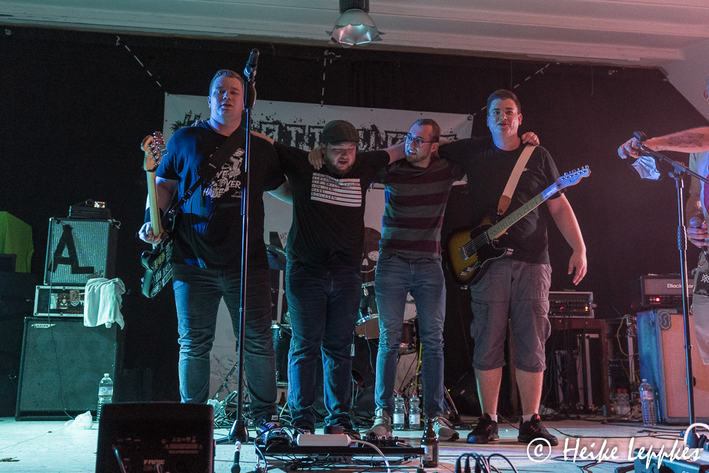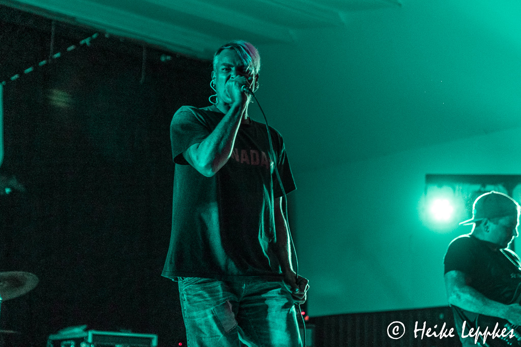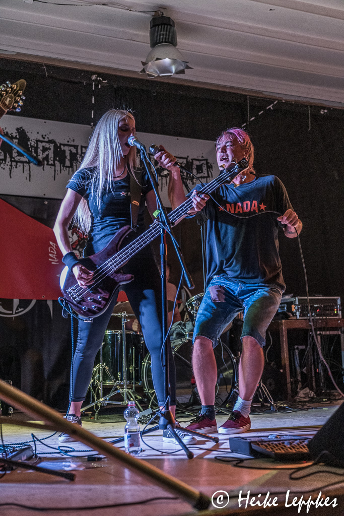 Nach dem Post-Post-Punk von Aschkoze geht es weiter mit reinrassigem Punk(rock) von Nada. Irgendjemandem von dieser Truppe laufe ich schon vor Einlass immer über den Weg, die wuseln wirklich unablässig durch die Gegend. 😀 Auch hier wurde meine innere Frage nach dem Bandnamen durch ein Gespräch geklärt, dem ich mehr zufällig lausche. Da erzählt Sänger Dayglo Dave, dass ihm beim Blick in den nächtlichen Sternenhimmel der Gedanke durch den Kopf schoss, dass wir mit unserem Planeten in den unendlichen Weiten doch eher ein „Nichts“ seien. Dayglo hat die Band bereits im Jahr 2003 gegründet und ist seitdem das einzig verbliebene Mitglied der Ur-Besetzung. Er kann zu den Songs der heutigen Setliste auch immer kleine Geschichtchen erzählen, und so erfahren wir, wie St. Pauli, Hartz IV oder Auf Tour zu ihrem Songtitel gekommen sind. In den verschiedenen Konstellationen haben Nada bislang drei Alben veröffentlicht, Album Nummer 4 ist bereits in der Mache. Und Nada sind mit ihrem Set so schnell durch, dass auch noch Zeit für zwei Zugaben ist.