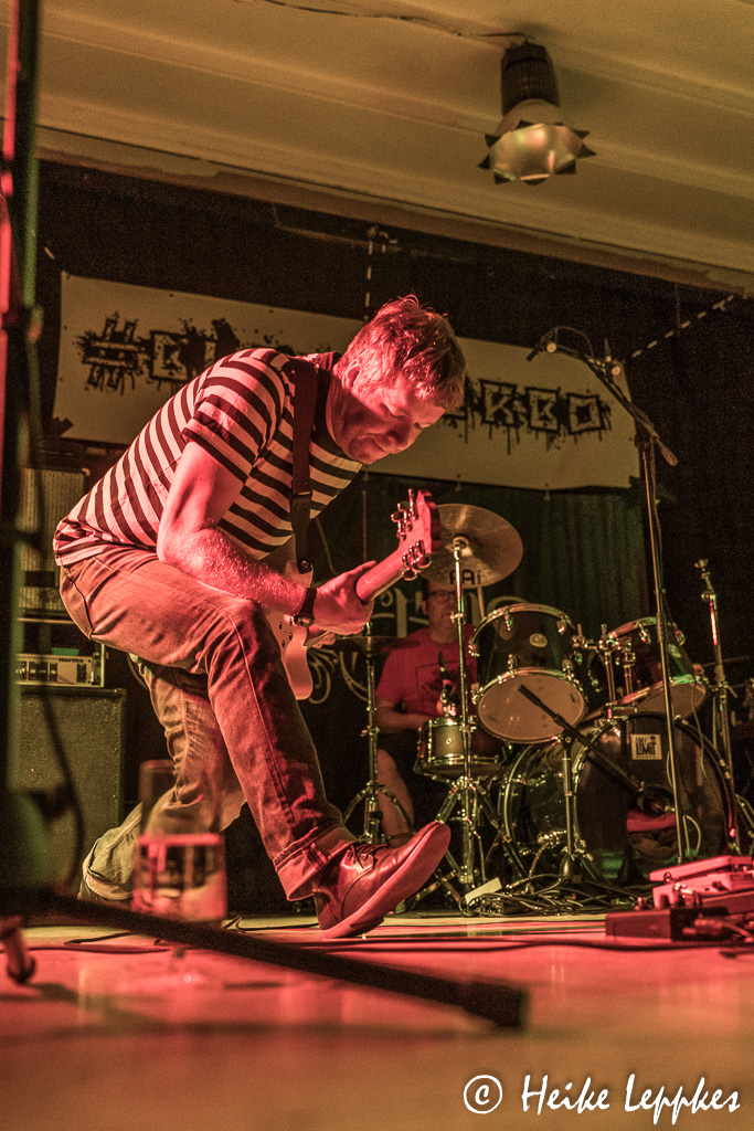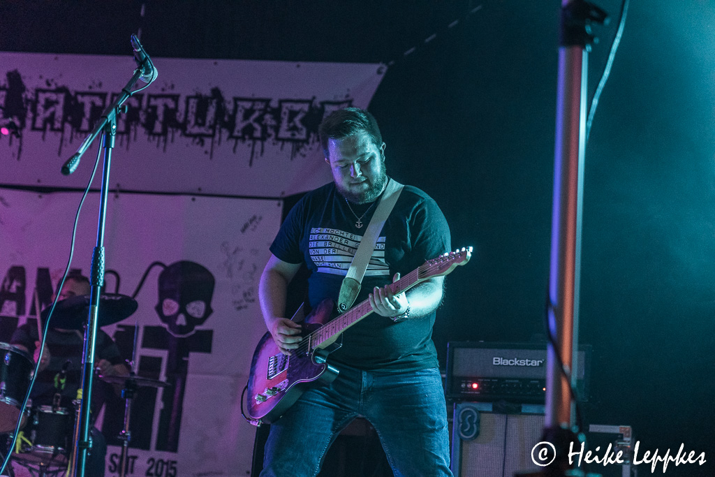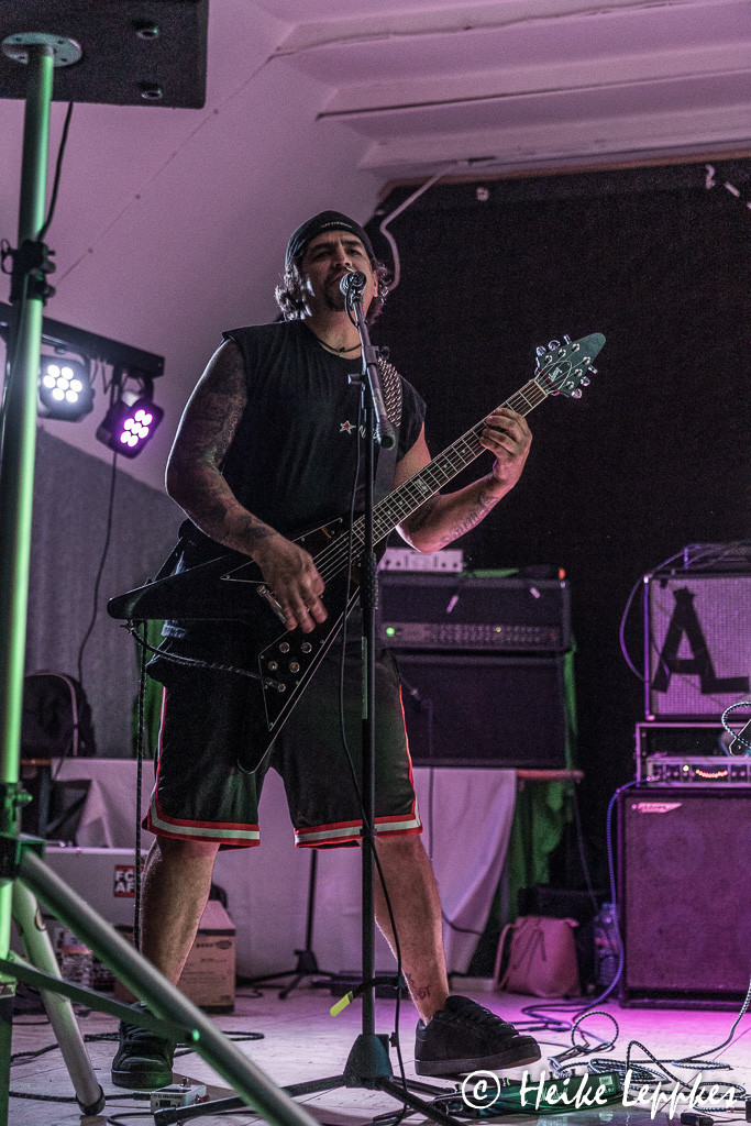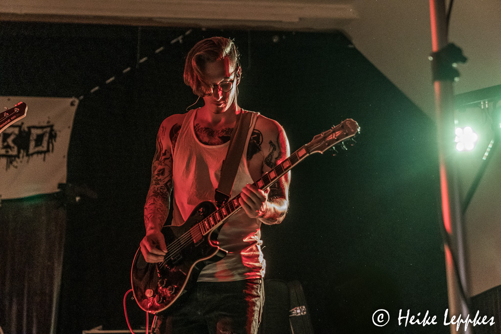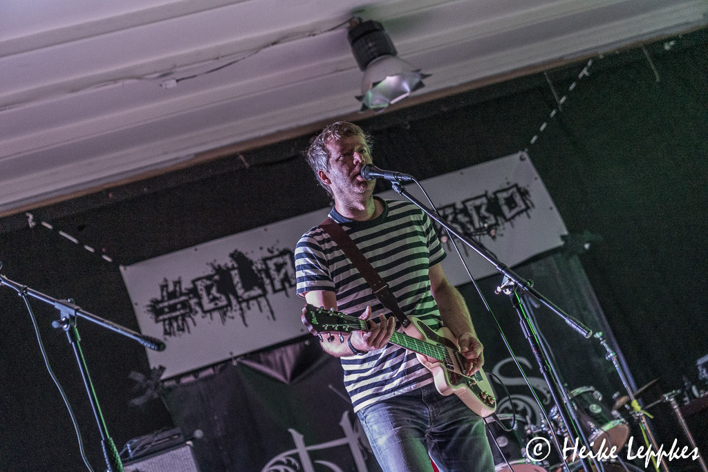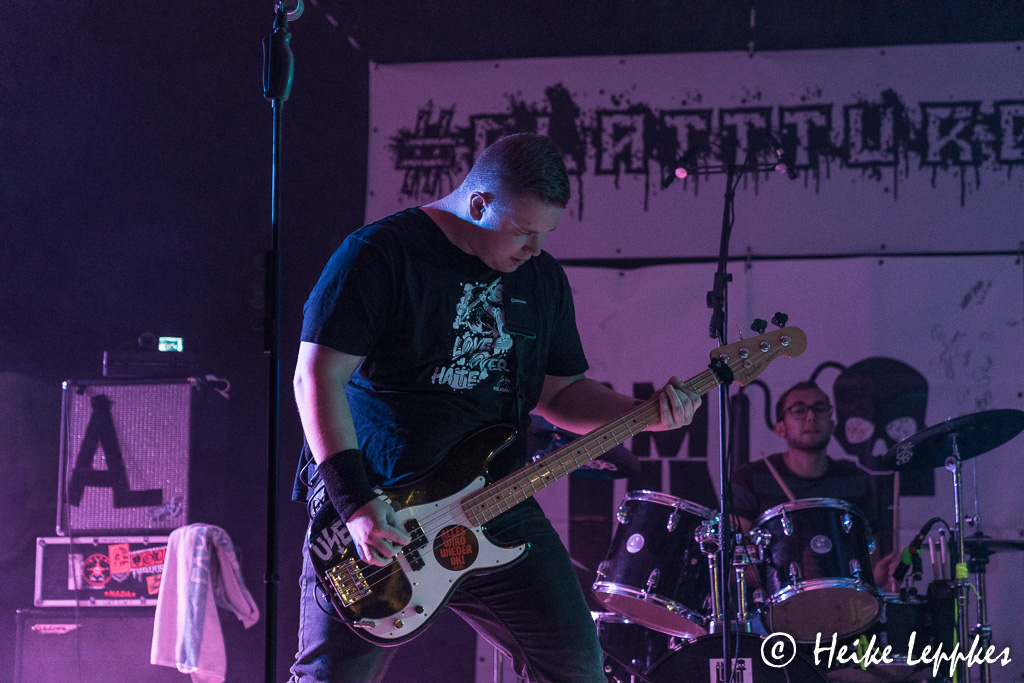 Nach dem Post-Post-Punk von Aschkoze geht es weiter mit reinrassigem Punk(rock) von Nada. Irgendjemandem von dieser Truppe laufe ich schon vor Einlass immer über den Weg, die wuseln wirklich unablässig durch die Gegend. 😀 Auch hier wurde meine innere Frage nach dem Bandnamen durch ein Gespräch geklärt, dem ich mehr zufällig lausche. Da erzählt Sänger Dayglo Dave, dass ihm beim Blick in den nächtlichen Sternenhimmel der Gedanke durch den Kopf schoss, dass wir mit unserem Planeten in den unendlichen Weiten doch eher ein „Nichts“ seien. Dayglo hat die Band bereits im Jahr 2003 gegründet und ist seitdem das einzig verbliebene Mitglied der Ur-Besetzung. Er kann zu den Songs der heutigen Setliste auch immer kleine Geschichtchen erzählen, und so erfahren wir, wie St. Pauli, Hartz IV oder Auf Tour zu ihrem Songtitel gekommen sind. In den verschiedenen Konstellationen haben Nada bislang drei Alben veröffentlicht, Album Nummer 4 ist bereits in der Mache. Und Nada sind mit ihrem Set so schnell durch, dass auch noch Zeit für zwei Zugaben ist.