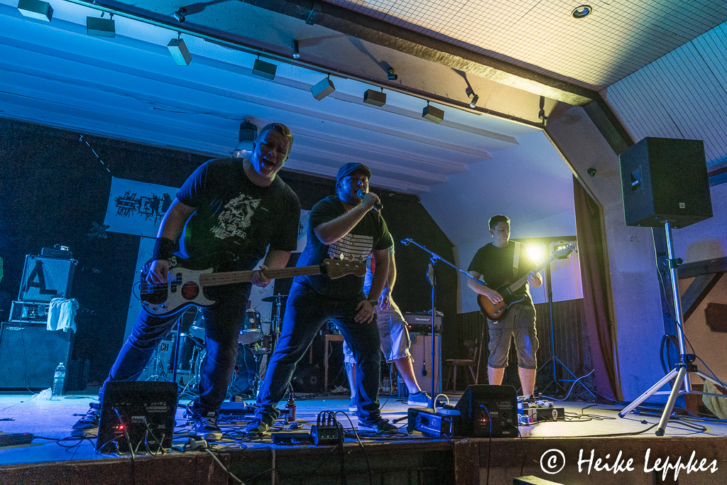 Aus Düren sind die Jungs von Am Limit angereist. Gegründet wurde die Band im Jahr 2015, im vergangenen Jahr erschien das Debütalbum Es Wird Zeit. Der Titeltrack findet sich natürlich ebenso auf der Setliste, wie Kleiner Dummer Nazi, Scheiß Pessimist oder Wir Feiern Das Leben. Dabei nehmen Am Limit, wie man an den Songtiteln schon sehen kann, niemals ein Blatt vor den Mund und beziehen immer klar und deutlich Stellung. Aber sie reden nicht nur sondern machen auch. Alle Erlöse, die mit dem gerade veröffentlichten Livealbum erzielt werden, gehen nämlich zu 100% an die Opfer der Flutkatastrophe. Auf dem Album finden sich 17 Songs aus den beiden Livestreams, die Am Limit im Krachgarten in Wesel gespielt haben. Für 10€ kann man sich also energiegeladenen Punkrock geben und gleichzeitig was Gutes tun. Daumen hoch dafür! Für eine andere Nachricht, die Am Limit heute verkünden, gibt’s allerdings definitiv keinen Daumen hoch. Nachdem Bassist Dennis nämlich bereits im August verkündet hatte, dass er Am Limit verlassen wird, gibt’s heute von Fabian die schlechte Nachricht, dass man gemeinsam beschlossen habe, die Band aufzulösen. Nach der heutigen Show werden Am Limit noch drei weitere Shows spielen, dann ist endgültig Schluss. Bis dahin geben die Jungs aber natürlich weiterhin alles und lassen sich heute auch nicht davon beeindrucken, dass eine Saite der Rhythmusgitarre reißt. Kurzerhand wird umdisponiert, Sänger Fabian gibt seine Gitarre weiter, Martin von Blattturbo wird auf die Bühne gerufen, und dann ist ein letztes gemeinsames Absingen angesagt.