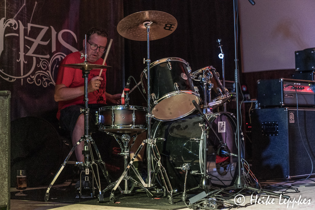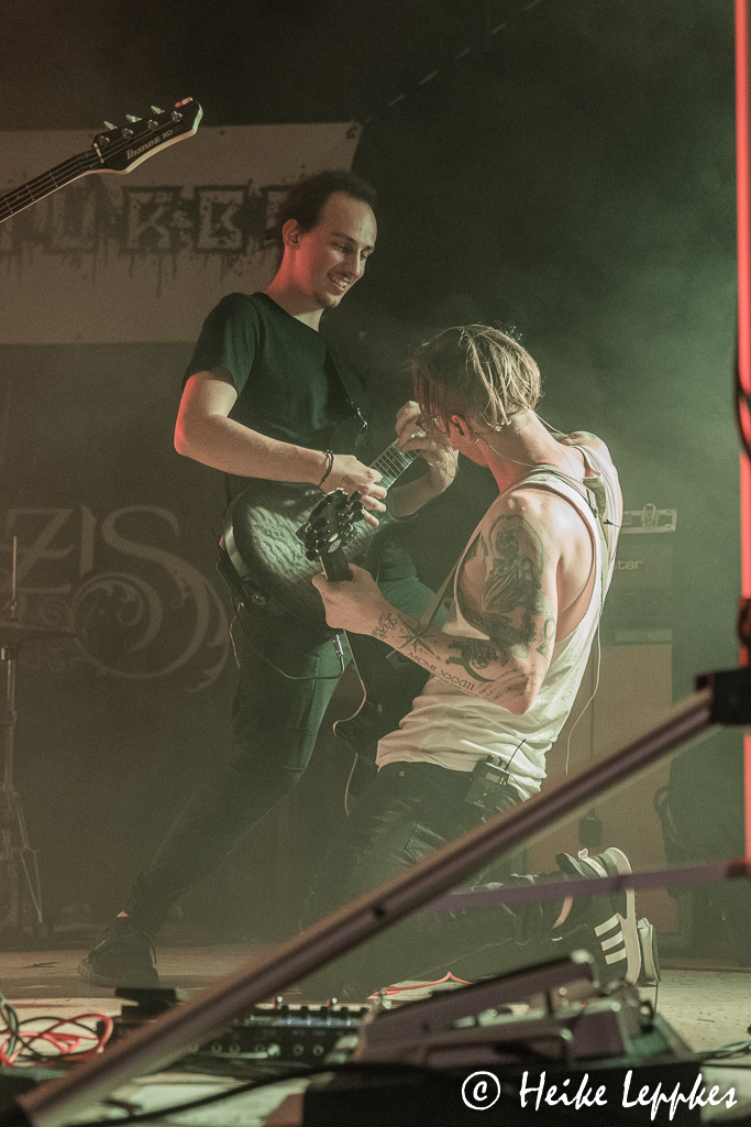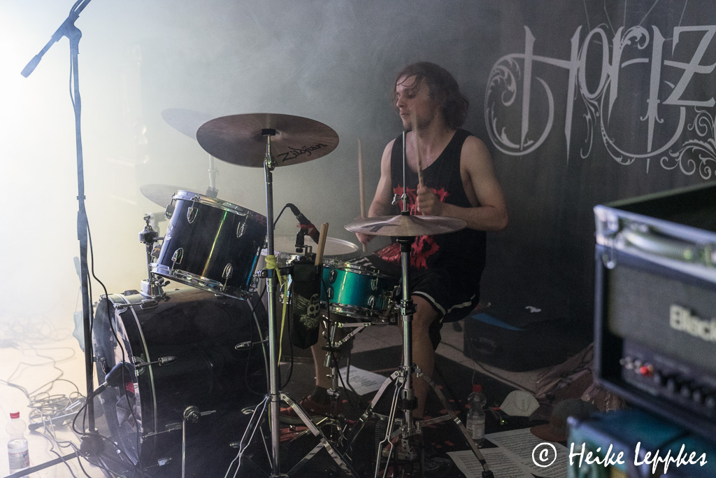 Nach zwei Bands, die die Flagge des Punk hochhalten, bin ich zugegebenermaßen sehr froh, dass jetzt eine Metalband kommt, die ich zudem schon einige Male live erleben durfte. Horizis machen erst mal so etwas wie einen öffentlichen Soundcheck, da ist die Sicht auf die Bühne noch klar. Dann drückt Basti den Schalter für die Nebelmaschine aber so lange, dass man die sechs auf der Bühne eher erahnen denn wirklich sehen kann. Mit meinem absoluten Lieblingssong geht’s gleich mal los, und das Intro zu Knightfall kann man natürlich auch heute problemlos als Intro verwenden. Der Song lehnt sich an das Videospiel Dark Souls an, und so ist auch das Video zu Knightfall gestaltet. Schaut es euch mal an! Aber der „Nerd Metal“ von Horizis ist nicht nur von Video- und Brettspielen inspiriert. Für die Songs vom ersten Album Heavy Lies The Crown aus 2019 haben sich Horizis in die griechische Mythologie vergraben. Von dem Album gibt’s heute Schizophrenia und God Of Fire genauso, wie den Farewell Song. Das ist passenderweise der letzte Song auf der Setliste, aber nicht nur die Fans von Horizis verlangen mit lauten Rufen nach einer Zugabe. So dürfen wir also ein letztes Mal ordentlich headbangen, bevor Horizis die Bühne für die letzte Band des Abends räumen und die Nebelschwaden nach wie vor in der Luft wabern.