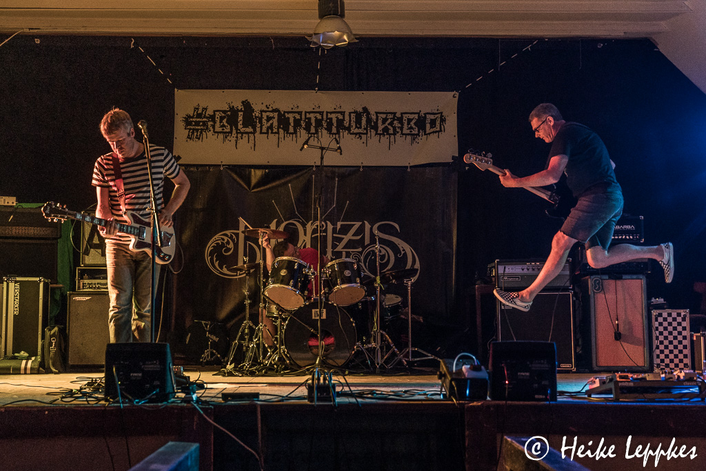 Einen knappen Monat nach dem Blattturbo Benefiz-Abend ist heute mal wieder eine Fahrt nach Euskirchen angesagt. Vier Bands wollen beim heutigen Bandabend unterhalten, wobei drei davon sich in einem Genre bewegen, das eher nicht meins ist, nämlich Punk(rock). Aber da meine musikalischen Scheuklappen sehr klein sind, steige ich ins Auto und komme, da die Autobahnen erfreulich frei sind, weit vor Einlass am Klosterhof an. Bei dem schönen Wetter kann man aber gut draußen stehen und mit dem Team quatschen. Als Horizis dann nach ihrem Soundcheck ebenfalls rauskommen, ist natürlich erstmal eine fröhliche Begrüßung angesagt. Dass heute nicht wirklich viele Gäste den Weg in den Klosterhof finden, ist schon sehr schade. Aber Martin von Blattturbo nimmt es mit Galgenhumor und erklärt den Bandabend kurzerhand zur „offenen Bandprobe mit Zuschauern“. Die erleben die auf dem Veranstaltungsbanner noch genannten Silent Behavior nicht, die mussten nämlich vor einigen Tagen krankheitsbedingt ihren Auftritt absagen.