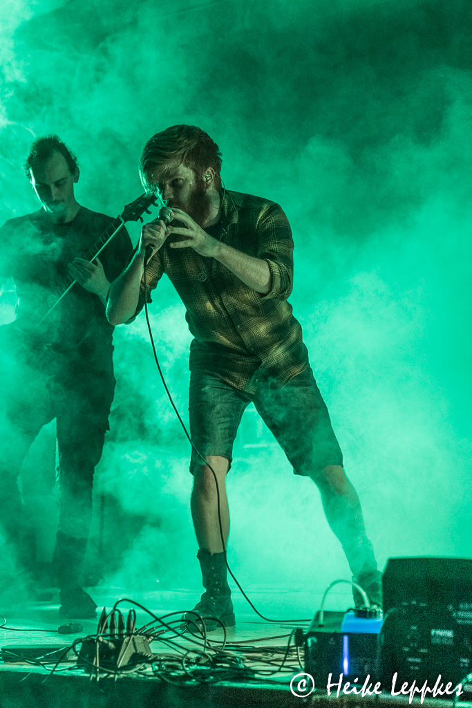 Die erste Band des Abends, Aschkoze, hat bei mir gleich mindestens zwei Fragen aufgeworfen; die erste betrifft natürlich den Bandnamen, wobei ich aus irgendeinem der vielen Gespräche, die vor dem Klosterhof stattfinden, rausgehört habe, dass hier ein Buchstabe ausgelassen wurde. Ok… (?) Was es mit dem Post-Post-Punk auf sich hat, konnte ich genau so wenig herausfinden. Mich hat es streckenweise ein wenig an einige Vertreter der Neue Deutsche Welle erinnert, z. B. Rheingold. An vielen Stellen jedenfalls überaus tanzbar, da hatte meine Kamera dann mal Pause. Aschkoze lieben es jedenfalls, mit der deutschen Sprache zu spielen. Das kann man sowohl ihren Facebook-Posts entnehmen, als auch den Songtexten. Heute erlebt ihr Bassist Rangel Koze, der irgendwann im vergangenen Jahr bei Aschkoze eingestiegen ist, so etwas wie seine Bühnentaufe. Ob das der Grund dafür ist, dass er eher zurückhaltend erscheint, oder doch die Tatsache, dass es vor der Bühne ja leider ziemlich verwaist ist, bleibt sein Geheimnis.