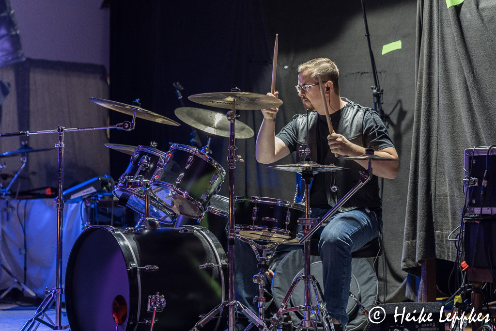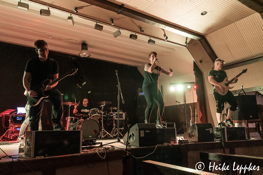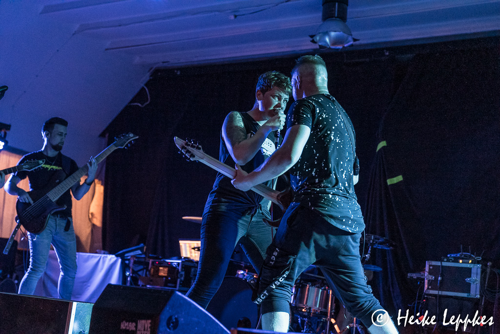 Auf Heavy Rock folgt Metalcore. Ich hatte ja schon einige Reviews zu Songs von Northern Light und auch deren EP Into The Dark geschrieben, die Jungs aber tatsächlich noch nie live erleben dürfen. Mit Drummer Jonas habe ich einen sehr entspannten Nachmittag beim Heimatsommer in Düsseldorf erlebt (meinen Bericht findet ihr hier), aber da war er ja mit 4 Meter Hustensaft am Start. Schon beim Schreiben der Reviews habe ich mich gefragt, ob die Jungs die Clean Vocals wohl auch live hinbekommen. Und bereits beim Soundcheck kann ich diese Frage eindeutig mit „ja“ beantworten. Weder Alexander noch Johannes, der neben Clean Vocals auch noch Shouts beisteuert, geben sich eine Blöße und beherrschen nicht nur ihre Instrumente, sondern auch ihre Gesangsparts. Das Reden zwischen den Songs übernimmt Sänger/Bassist Pascal. Er und Jonas müssen ihre Instrumente nicht tauschen, aber für die „härteren und djentigeren“ Songs, wie Pascal sie ankündigt, werden beide Gitarren ausgetauscht, wobei die gelbe von Johannes schon ein kleiner eyecatcher ist. Neben der mit progressiven Einflüssen durchsetzten Musik legen Northern Light auch sehr viel Wert auf die Texte. Und welcher Song könnte aktueller sein als der, der den gleichen Namen trägt, wie die Band. In Northern Light wollen die Jungs nämlich allen, die gerade in einer schwierigen Situation sind, zurufen „lass dich nicht unterkriegen, mach weiter, du schaffst das!“. Auch Self Destruction packt ein Thema an, das uns schon lange beschäftigt, nämlich, wie wir Menschen unsere Welt, auf der wir leben, selbst zerstören. Schwere Kost, die aber nicht davon abhält, zur energiegeladenen Show und zur Musik von Northern Light ordentlich abzugehen, zu moshen und zu headbangen.