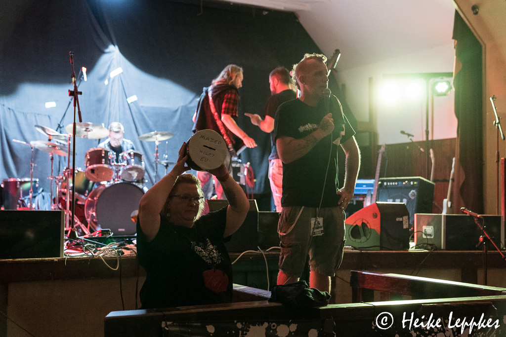 Im Veranstaltungsraum ist ein emsiges Gewusel, der Aufbau läuft noch, Soundcheck ist in weiter Ferne. Diese Zeit nutzt Martin für eine kleine Auktion, die die ersten Euros in die Sammelbüchse fließen lässt. Versteigert werden unter anderem von den Bands gestaltete Frühstücksbrettchen und Bandshirts. Dann kann es aber, mit einer knappen Stunde Verspätung, endlich losgehen.