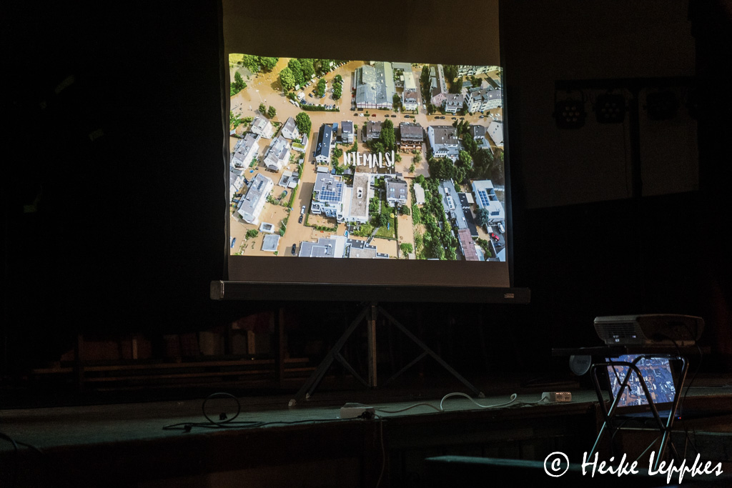 Ich hatte ja eigentlich gedacht, dass die Show jetzt beendet ist, aber Martin kündigt es an, es gibt noch ein Video. Während also im hinteren Teil der Bühne schon fleißig abgebaut wird, wird vorn eine kleine Leinwand hingestellt und der Beamer aufgebaut. Bereits seit geraumer Zeit sind die Mitglieder von Mazed schon anwesend. Die hatten die bereits eingangs erwähnte Spendenaktion ins Leben gerufen und haben, inspiriert von den schrecklichen Bildern aus den Katastrophengebieten, den Song Niemals! produziert. Das dazugehörige Video gibt es also jetzt, und nicht nur ich kriege bei den Bildern eine ganz dicke Gänsepelle. Und während Rules Of This Game noch gespielt haben, war Martin fleißig und hat die Einnahmen des heutigen Abends errechnet. So kann er dem heute anwesenden Andreas dann stolz 587€ überreichen. Aus der Spendenaktion von Mazed kommen noch einmal 800€ dazu, so dass insgesamt 1.387€ an den sichtlich gerührten Andreas übergeben werden können.