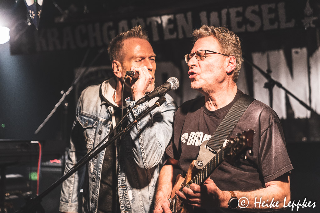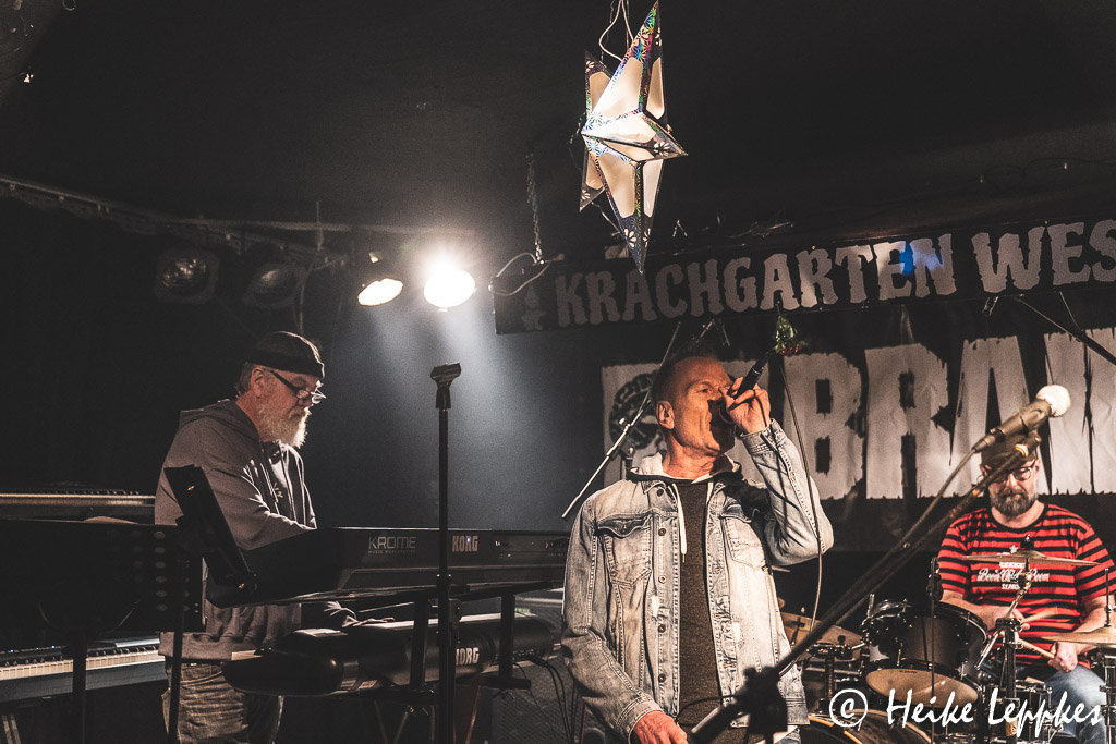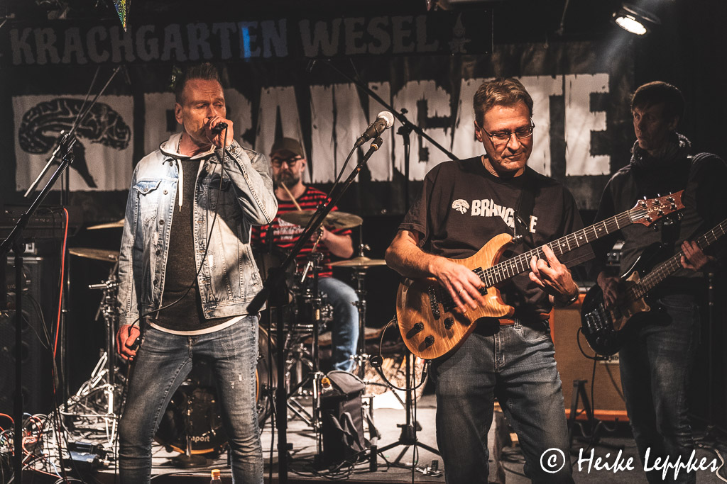 Nachdem ich jetzt schon an den vergangenen drei Sonntagen am Frühschoppen im Krachgarten teilgenommen habe, mache ich mich auch zur letzten Show für dieses Jahr auf den Weg nach Wesel. Dieses Mal sind Braingate angekündigt, und ich habe mich schon von Anfang an gefragt, wie man auf diesen Bandnamen kommt. Das kann mir dann auch deren Gitarrist Thomas beantworten, mit dem ich vor der Show ins Gespräch komme. Da bin ich gerade an den richtigen geraten, denn der Bandname kommt von ihm. Er ist ihm im wahrsten Sinne des Wortes ins Hirn geschossen, als er mit seinem Hund spazieren war und mit allen Sinnen die Eindrücke der Natur genoss. Das kann man im Raum Bocholt, wo die Band herkommt, wohl auch besonders gut.