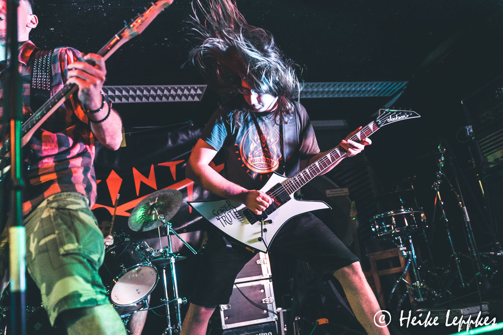 Ich war ja, wie üblich, ziemlich weit vor Einlass vor Ort, aber die Zeit, bis die Show dann losgeht, wird nicht lang, denn mit irgendwem ergibt sich immer ein kurzweiliges Gespräch. Dann ist es aber soweit, auf der Bühne bauen sich die Jungs von Absinth auf, vor der Bühne ihre Fans. Der Name „Kuschelclub“ trifft übrigens den Nagel auf den Kopf, der Platz vor der Bühne ist ungefähr genauso tief, wie die Bühne selbst, da wird’s kuschelig. 😀 Aber auch wir drei Fotografen schaffen es, unfallfrei aneinander vorbeizukommen. Und das schaffen die Jungs von Absinth auch. Die Band gibt es schon seit dem Jahr 2015, ihr selbstbetiteltes Debütalbum erschien im Spätsommer 2019. Aber die Jungs können natürlich auch bereits mit neuen Tracks aufwarten, und so ist ihre Setliste ein bunter Mix. Von Songtiteln wie Kokain schnüffeln, Zombie, Psycho Terror oder Shot ‚Em Dead sollte man sich nicht abschrecken lassen, das ist sehr cooler Thrash Metal. Und während die Jungs topfit an ihren Instrumenten sind, sind die Fans vor der Bühne topfit, was die Texte betrifft.
