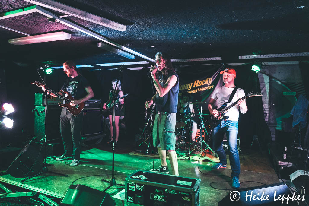 Bei Johnny Rocky and The Weekend Warriors hat sich besetzungstechnisch einiges getan, seit ich sie im Oktober letzten Jahres im Schlüsselloch in Aachen gesehen habe. Aus dem Quartett ist ein Quintett geworden. An den Drums sitzt seit November 2021 Dommie und mit Chris hat ein zweiter Gitarrist den Weg zur Band gefunden, der Johnny auch immer mal wieder gesangstechnisch unterstützt. Wenn man sich den stetig gefütterten Blogfeed auf der Homepage des Quintetts so anschaut, könnte man sich fragen, ob die fünf kein Zuhause haben. Nur unterwegs, und heute hier in Troisdorf am Start. Wie üblich, schafft es Johnny in seinen Ansagen immer wieder sehr elegant, zum nächsten Songtitel überzuleiten, und dann ist auch endlich mein Favorit dran. Auch die Setliste von Johnny Rocky and The Weekend Warriors ist ein Mix aus Altem und Neuem, da gibt’s mit Godzilla oder Zombieland Songs vom selbstbetitelten 2019er Album, das Album Call Me aus 2021 wird mit dem Titeltrack, School Work Death, Belly Of The Beast oder eben Party All Alone bedacht. Und natürlich findet auch No Illusions seinen Platz auf der Setliste. So ist auch bei Johnny Rocky and The Weekend Warriors gemeinsames Absingen angesagt. Das übernehmen auch teilweise die Jungs von Absinth, die jetzt alle vor der Bühne stehen. Und Nils darf dann auch bei einem Solo in die Saiten von Matts Gitarre greifen, sehr cool!