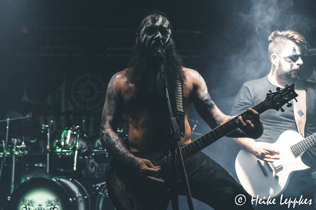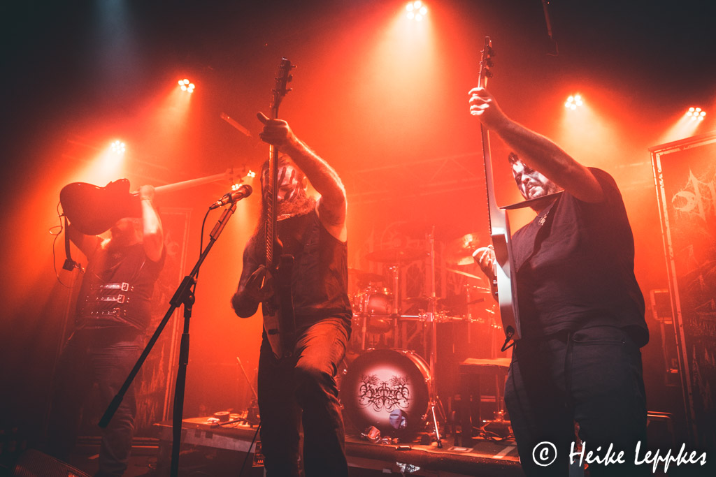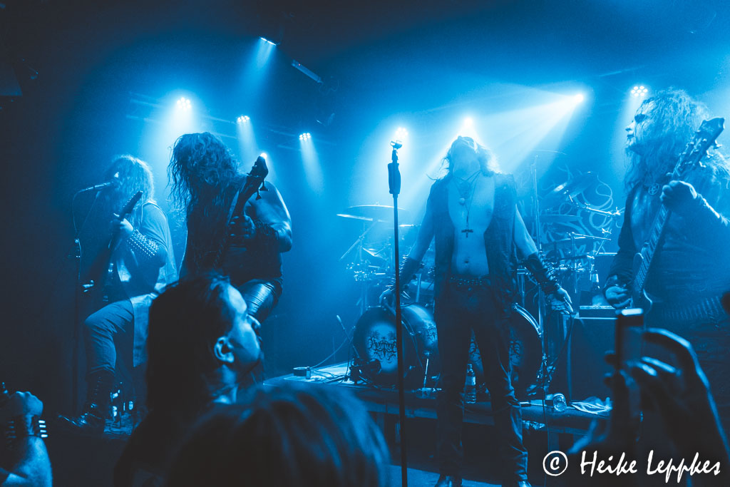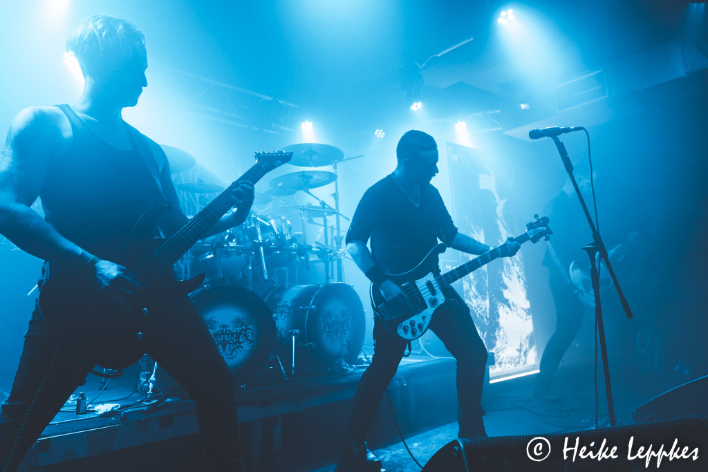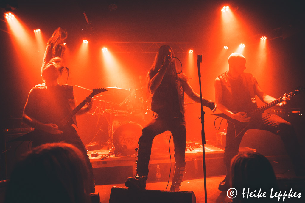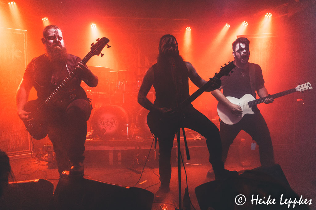 Und dann kommen nacheinander die zwei Bands, die ich schon im April auch hier im Helvete erleben durfte. Anheim hätten heute eigentlich als zweite Band spielen sollen, aber die Running Order wurde, warum auch immer, kurz vor Beginn noch einmal umgestellt, also spielen sie jetzt in der „goldenen Mitte“. Aus Würzburg kommt die Band, und so gesprächig, wie sie noch vor der Show waren, gibt’s, wie auch bei den anderen Bands, fast nur die Musik auf die Ohren. Das ist bei Anheim sehr geiler Melodic Black Metal, der sich auch gern mal aggressiv gibt und sich meistens im höheren Tempo bewegt. Dass es die Band erst seit ungefähr zwei Jahren gibt, lässt sich beim Zuschauen nicht erahnen, denn da steht eine kompakte Einheit auf der Bühne. Mitgebracht haben sie nicht nur ihre EP Maere einer alten Zeit aus dem letzten Jahr, sondern auch das aktuelle Album Anihorim, das mit seinen acht Tracks auf ungefähr 46 Minuten Spielzeit kommt. So haben die Jungs also wahrscheinlich bei der Setliste eher die Qual der Wahl, treffen aber mal wieder voll meinen Geschmack. So landet Anihorim dann nach der Show auch in meinem Rucksack.