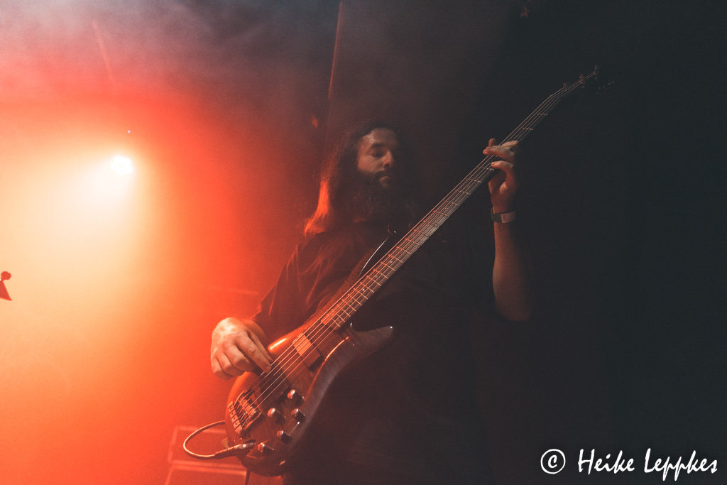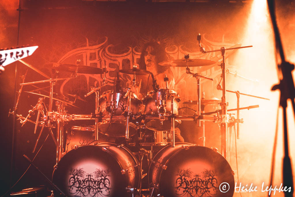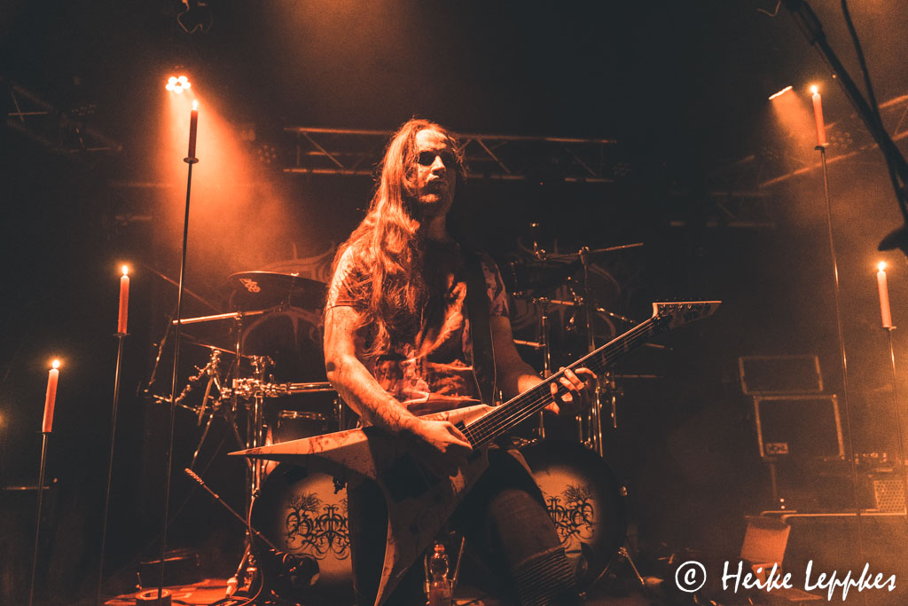 Den musikalischen Abend eröffnen dürfen Bedrängnis. Über die habe ich nicht wirklich viel rausfinden können, aber ein kurzer Blick auf die Setliste lässt mich ahnen, dass die Songs länger sind. Die erste Single des Duos wurde im Juli 2020 veröffentlicht, im Februar dieses Jahres erschien das Full Length-Album Die Bürde die wir tragen. Bei dem Band- und dem Album-Namen kann man sich fast denken, was es jetzt gibt, nämlich eher getragene Stücke aus der Richtung Depressive Suicidal Black Metal. In Szene gesetzt wird die Show nicht nur von den Scheinwerfern, die die Bühne in rotes Licht tauchen, sondern auch durch die (echten!) Kerzen, die vor der Show von Drummer Fuath entzündet werden. Vor ihm steht Aeshma (Gesang, Gitarre), der in den langen Instrumentalparts immer mal wieder auf der Bühne unterwegs ist, und sich mal auf der linken, mal auf der rechten Seite präsentiert, bevor er wieder zurück ans Mikro muss. Wenn Aeshma bei der Bühnenpremiere nervös ist, lässt er es sich zumindest nicht anmerken, und das Duo kann sich über den mehr als wohlwollenden Applaus freuen.