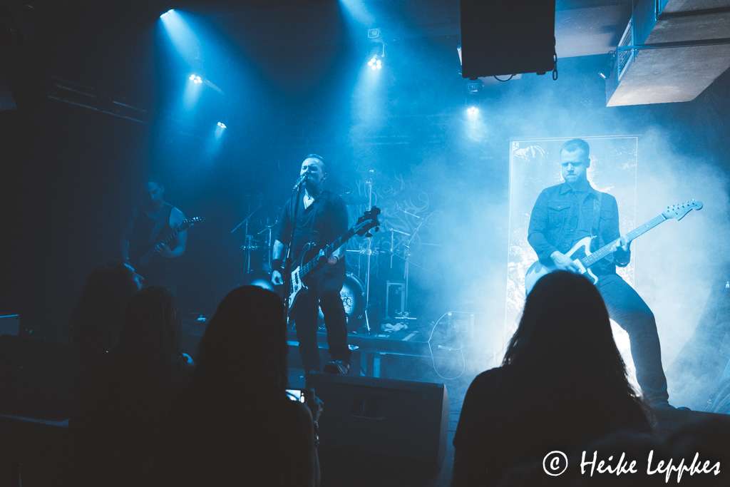 Wie schon Anheim spielen heute auch Lighthouse ohne Drummer. Warum dem so ist, weiß ich nicht, aber eine Record-Releaseshow sagt man natürlich nicht ab. Gegründet wurde die Band im Jahr 2018, damals noch als Trio, und nach der schlicht A Debut bezeichneten Debüt-EP aus 2020 spielten die Jungs ihren ersten Gig tatsächlich erst im August letzten Jahres. Genau heute auf den Tag erschien nun das Album I. Das kommt inklusive Intro, Interlude und Outro auf knapp 37 Minuten Spielzeit, und den Texten, die in dem sehr schick aufgemachten Booklet abgedruckt sind, entnehme ich, dass Lighthouse einen eher düsteren Blick auf das Leben an sich und die Natur werfen. „…Don’t let this coldness be our grave…“ heißt es im Chorus von The Lighthouse, und auch die drei Jungs sind auf der Bühne in blaues Licht getaucht. Das kann zwar die mittlerweile saunaartigen Verhältnisse im Helvete, gegen die die auf Hochtouren laufende Lüftungsanlage machtlos ist, auch nicht ändern, setzt das Trio aber perfekt in Szene. Performancetechnisch halten sie sich zurück, so können wir uns zu später Stunde voll und ganz auf die Songs konzentrieren, die auf der Setliste ihren Platz gefunden haben.