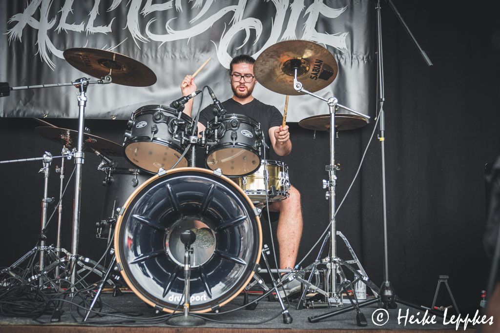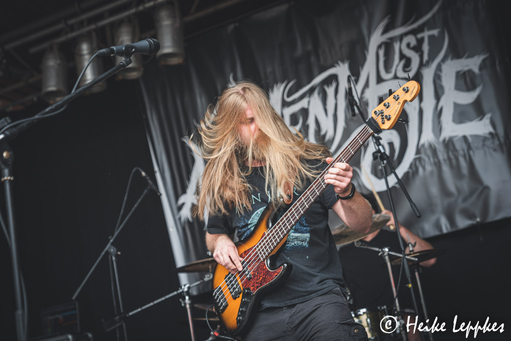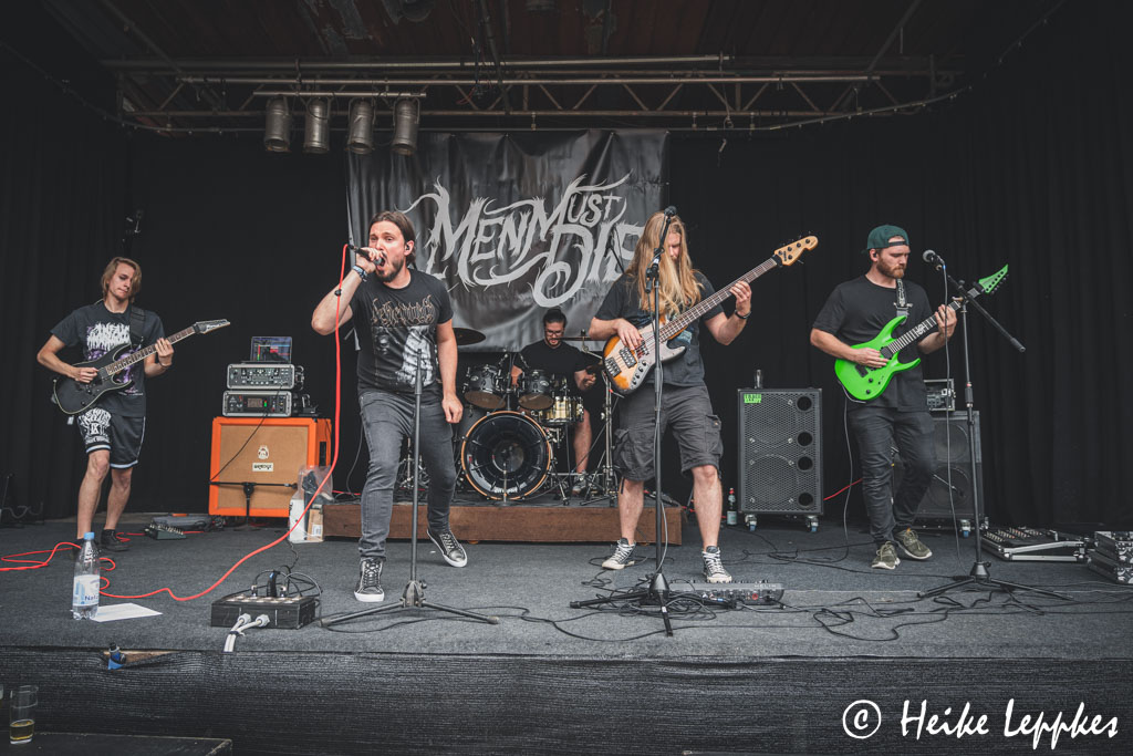 Wenn ich für den Beitragstitel noch einen Untertitel formulieren müsste, würde er wohl irgendwas in Richtung „Der Frühschoppen, der mit zwei sehr geilen Shows vielen technischen Problemen trotzt“ lauten. So ziemlich das erste, was ich höre, als ich ankomme, ist, dass den Jungs von All Men Must Die ein Verstärker abgeraucht ist. So herrscht auf der Bühne also emsiges Treiben, Tontechniker Kenny würde sich wohl am liebsten klonen, der wird nämlich an allen Ecken und Enden gebraucht. Ein Ersatz-Verstärker wird zwar gefunden, das ist aber nur die erste von diversen Schwierigkeiten, mit denen beide Bands heute zu kämpfen haben. Normalerweise wäre ich mehr oder weniger entspannt. Da ich aber später noch nach Witten muss, wo der Metal For Mercy e.V. ein Open Air veranstaltet, bei dem ich ebenfalls fotografiere, werfe ich immer mal wieder einen Blick auf die Uhr.