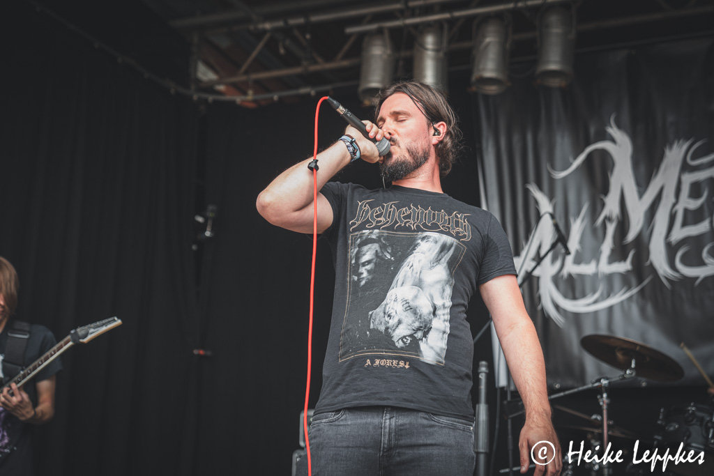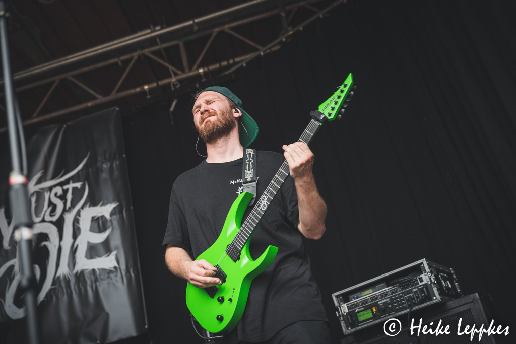 Dann ist es aber soweit, dass All Men Must Die loslegen können. Ich wollte eigentlich schreiben, dass ich die Band vorher noch nicht live erlebt haben, aber das hat wohl niemand, denn es ist die erste Show überhaupt, seit die Duisburger Band im Jahr 2019 gegründet wurde. So bin ich sehr gespannt, wie die Jungs sich schlagen. Auf ihre Fans, die sich ebenfalls vor der Bühne versammelt haben, können sich AMMD dabei verlassen, die feuern die Jungs immer wieder an, singen lauthals mit und starten auch bereits den einen oder anderen Moshpit. Auch mich hat das Quintett relativ zügig um den kleinen Finger gewickelt, denn nach Debütauftritt sieht das definitiv nicht aus. Abgesehen davon, dass die Instrumentenfraktion sehr versiert ist und AMMD mit Fabian einen richtig guten Shouter am Start haben, komme auch ich bei dem sehr geilen Metalcore in Versuchung, die Kamera wegzulegen und mich in den Pit zu stürzen. Sogar zu einer Wall Of Death lassen sich die Fans inspirieren, da halte ich dann aber lieber Abstand. 😀 Am Debütalbum arbeiten die Jungs nach wie vor, und so können sie neben bereits veröffentlichten Songs, wie Under Pressure oder Lost Connection, auch noch unveröffentlichte Tracks präsentieren. Auf der Bandcamp-Seite von All Men Must Die kann man sich die Songs alle anhören, und bei dem hohen Niveau, das sie alle haben, bin ich sehr auf das komplette Album gespannt. Der Auftritt heute war jedenfalls so energiegeladen wie kurzweilig.