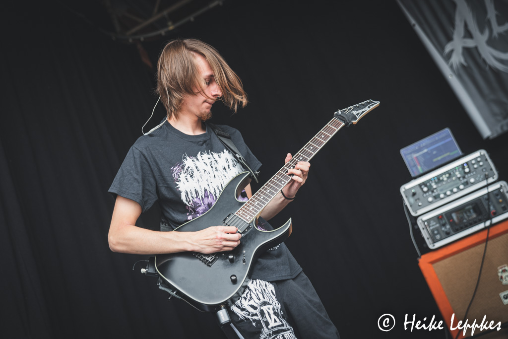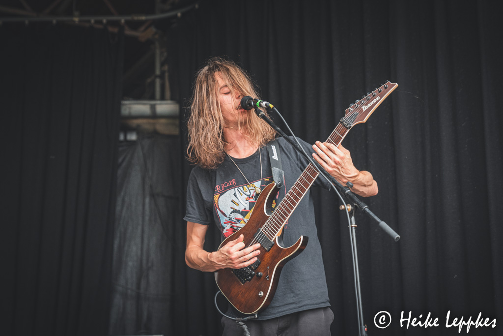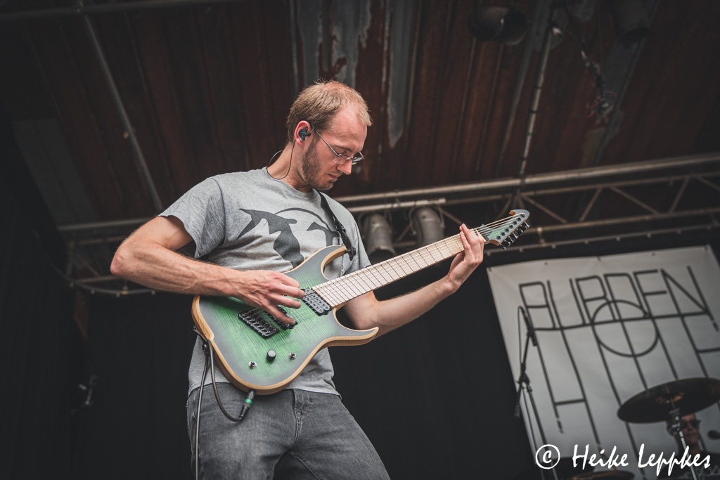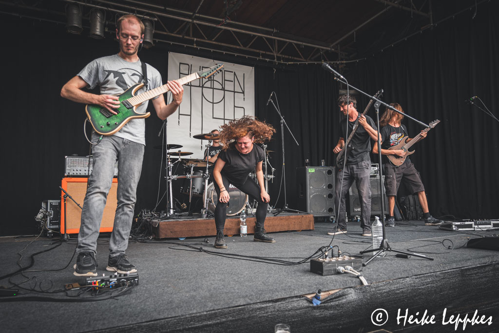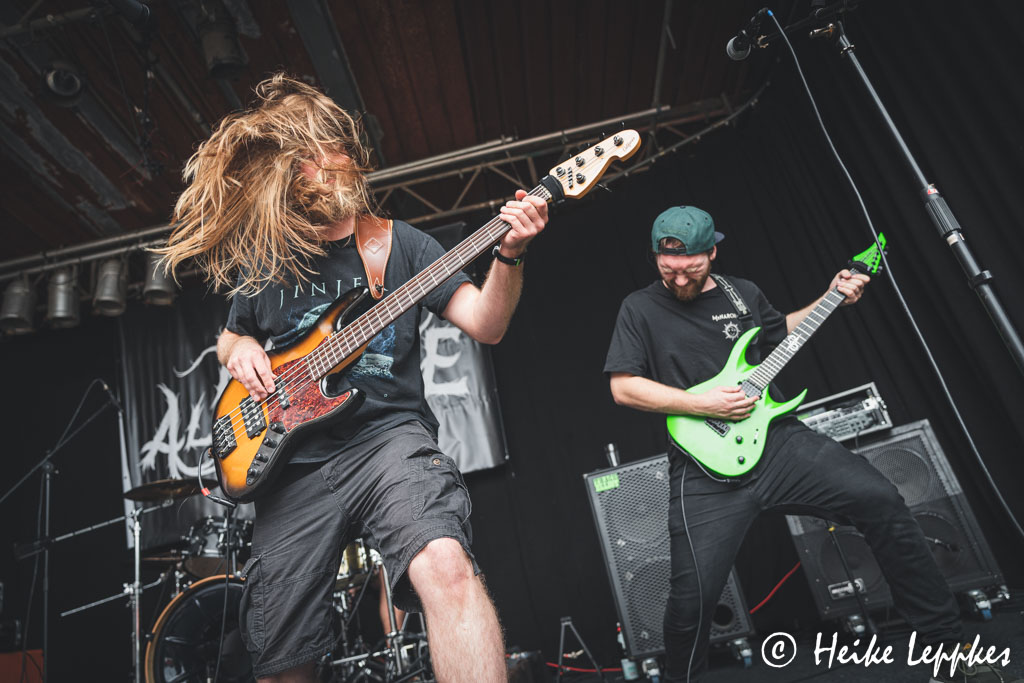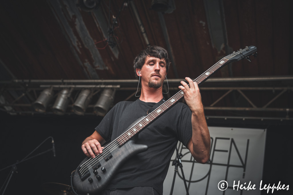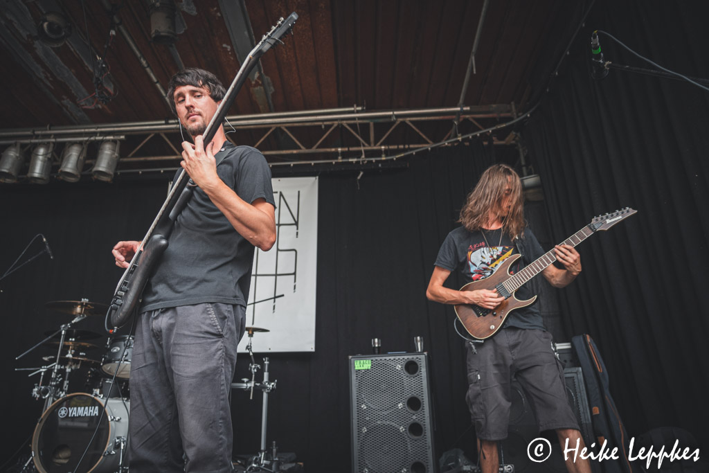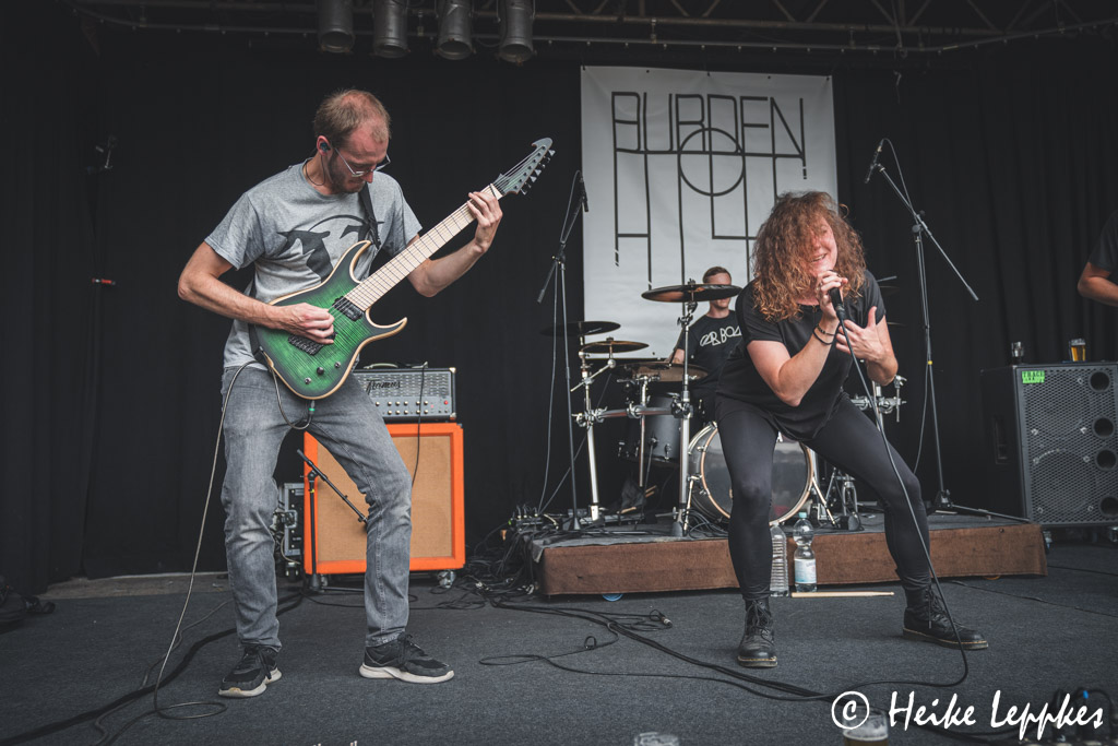 Auch Burden To Atlas habe ich bislang noch nicht live erleben dürfen, und in diesen Satz müsste ich tatsächlich ein „leider“ einfügen. Wie oft hat mich Gitarrist Abe, den ich von seiner anderen Band Oneiric kenne, schon zu Shows des Quintetts eingeladen? Und auch den zweiten Gitarristen und Sänger (Shouts/Growls) Niklas kenne ich zumindest von seiner anderen Band Boon Goon. Er ist, wie er mir erzählt, insgesamt in vier Bands aktiv, das ist ja mal ’ne Hausnummer! Auch Sängerin Martina, mit der sich sehr nette Gespräche entwickeln, sehe ich die Freude darüber an, dass ich nun endlich mal vor der Bühne stehe. Normalerweise ist es ja eher umgekehrt! 😀 Wenn ich es auf der schön puristisch aufgemachten Homepage richtig gelesen habe, gibt es Burden To Atlas seit dem Jahr 2018, und seitdem haben sie Ideen gesammelt und Songs geschrieben. Einige davon wurden verworfen, einige überarbeitet, und neue Ideen kamen dazu. So gibt es auf der Bandcamp-Seite von Burden To Atlas auch erst einen Song, nämlich Anxiety-Influenced Rationality-Influenced Reality. Der gehört mit seinen ungefähr sechs Minuten wohl zu den kürzeren. 😀 Und für das, was da musikalisch auf der Bühne abgeht, fehlen mir tatsächlich die Worte, und so erlaube ich mir, auszugsweise das zu zitieren, was Burden To Atlas auf ihrer Homepage selbst darüber sagen: „…das Ergebnis ist eine … Mischung aus cleanen Vocals und Harmonien, harschen Growls, schnellen und entspannten Komponenten, Breakdowns, Polyrhythmen und Polymetern…“. Da kommt der Pit einige Male ins Stottern, und auch mit dem Headbangen will es bei mir nicht so recht klappen. Stattdessen schaue ich der Instrumentenfraktion ganz genau auf die Finger, wobei ich mich auch bei den Jungs frage, wo die irgendwann mal hinwollen, wenn sie jetzt schon auf einem dermaßen hohen Niveau spielen.