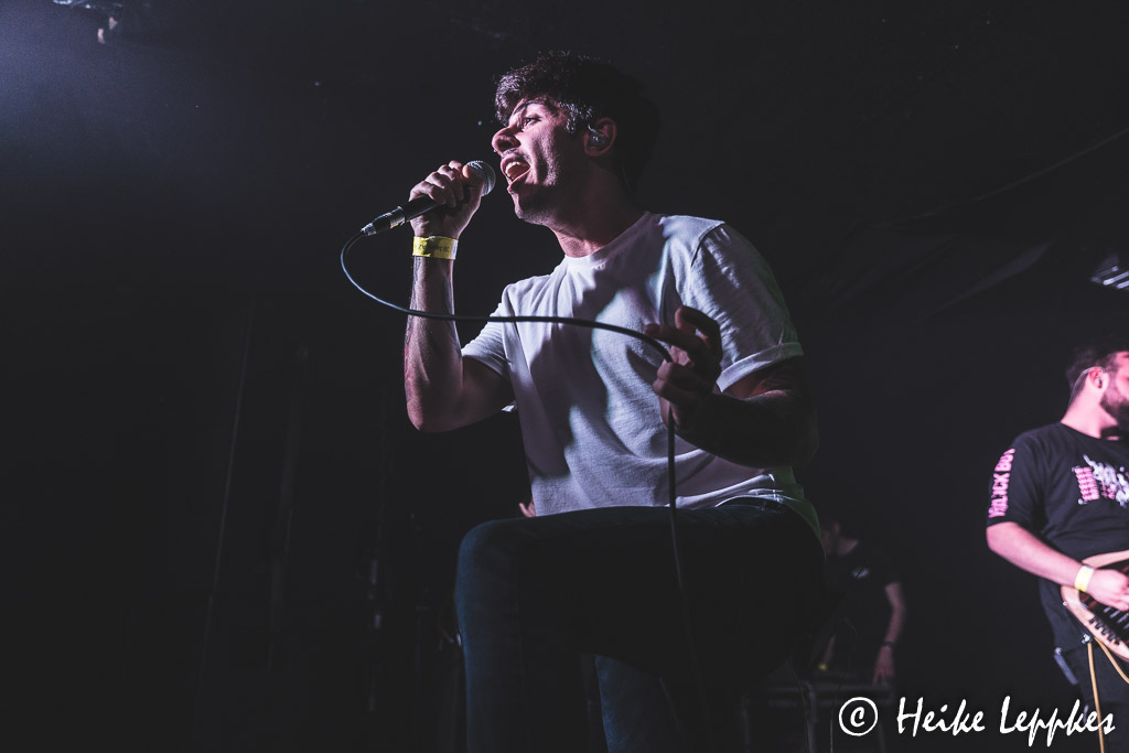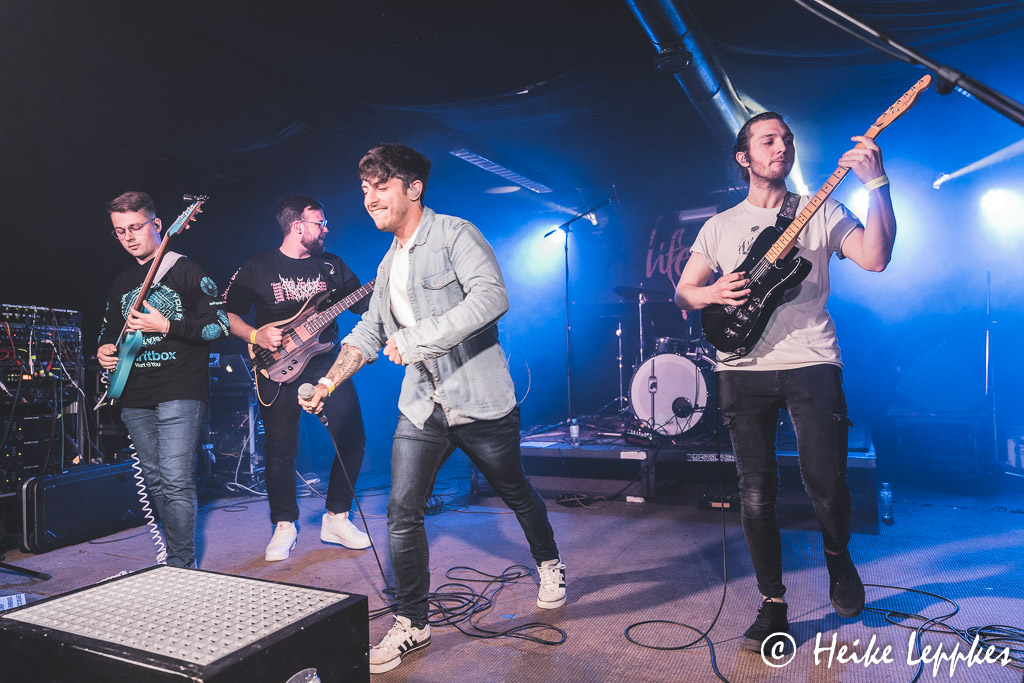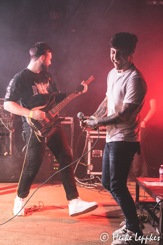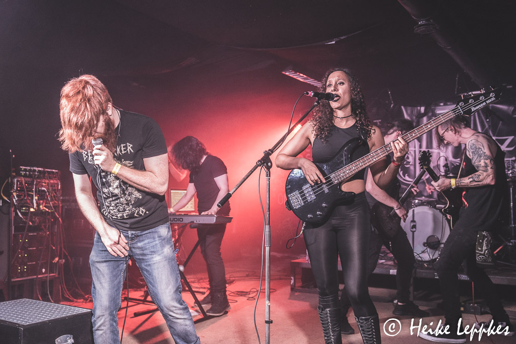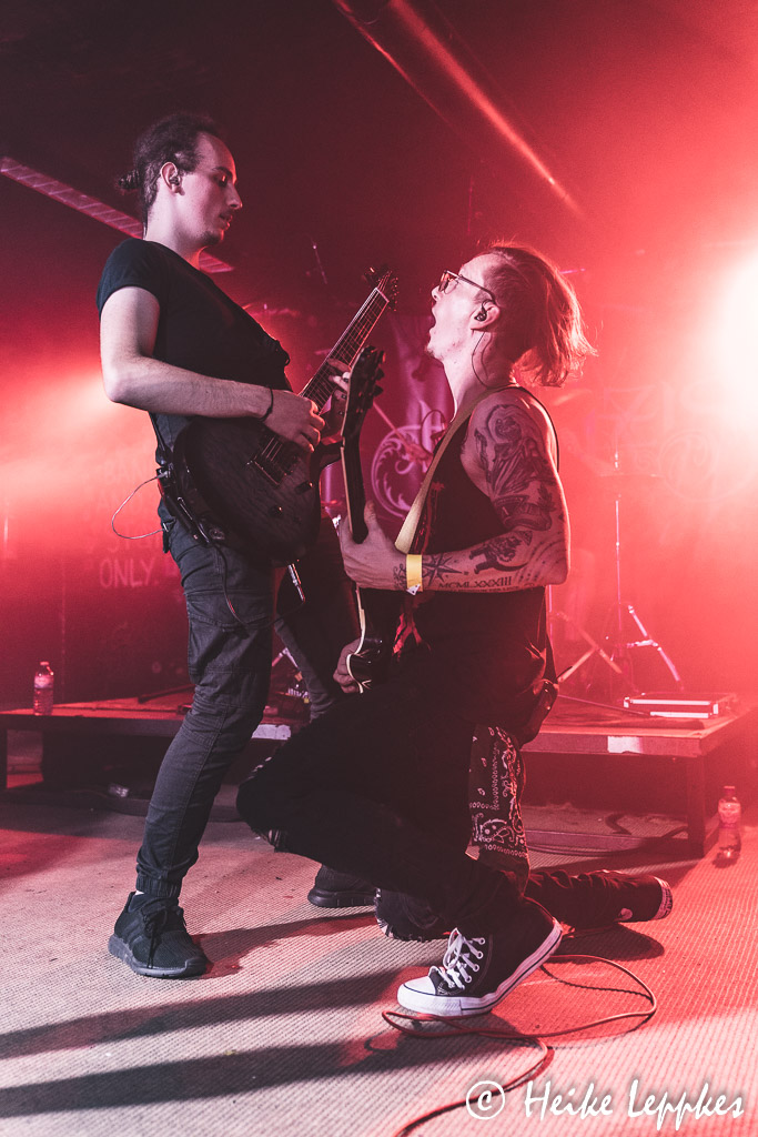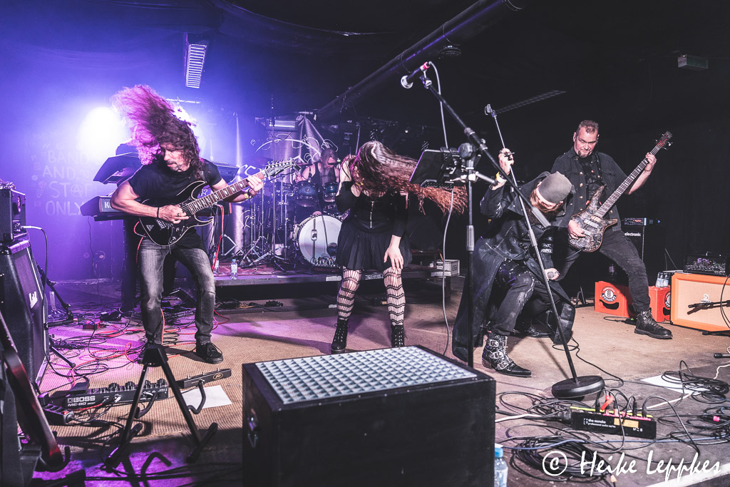 Ich hatte eigentlich damit gerechnet, dass jetzt Lifespark dran sind. Aber es machen sich tatsächlich Horizis bereit, und Martha hat auch im Verlauf der Horizis-Show eine Erklärung dafür: die Mitglieder von Horizis sind allesamt große Lifespark-Fans und wollen sich deren Show bei einem gepflegten Bierchen dann vor der Bühne geben. So findet man sie dann tatsächlich auch allesamt in der ersten Reihe, wo sie die Koblenzer ordentlich abfeiern. Aber erstmal sind sie selbst dran und starten gleich mit meinem absoluten Favoriten, nämlich Knightfall. Da hat die Kamera erst mal Pause, jetzt bin ich dran mit Headbangen. Und nach der vorletzten Single gibt’s dann erstmal eine Zeitreise durch die verschiedenen Etappen. Gleich vier Songs vom 2019er Album Heavy Lies The Crown folgen, wobei der älteste Song von Horizis, God Of Fire, mal den Arbeitstitel Techno Metal trug. Einfach zuhören, dann erschließt sich der Grund. 😀 Zwischen den Songs gibt’s immer wieder mal die eine oder andere Anekdote, wobei sich Bastian dann manchmal doch ein wenig verzettelt, was an einer Stelle zu dem Ruf „Jetzt spielt endlich weiter!“ aus dem Publikum führt. Der Aufforderung folgen Horizis aber natürlich gern. Einen Coversong haben Horizis auch dabei, es ist Sleepwalking von Bring Me The Horizon. Und hier stürmt dann plötzlich auch der Sänger von Lifespark auf die Bühne, um Guestvocals beizusteuern. Damit kann er mich auf jeden Fall schon mal überzeugen, und ich bin umso mehr auf die Show der Koblenzer gespannt. Dann ist es aber endlich soweit, dass der neue Song Total Party Kill auf der Setliste steht. Der wird natürlich auch ordentlich abgefeiert, wobei er leider auch das Ende des Auftritts einleitet. Mit dem Farewell Song verabschieden sich Horizis zunächst, wobei sie natürlich nicht ohne Zugabe entlassen werden. Da alle Songs der Setliste gespielt sind, gibt es noch einmal Total Party Kill, der noch einmal für ordentlich Bewegung vor der Bühne sorgt.