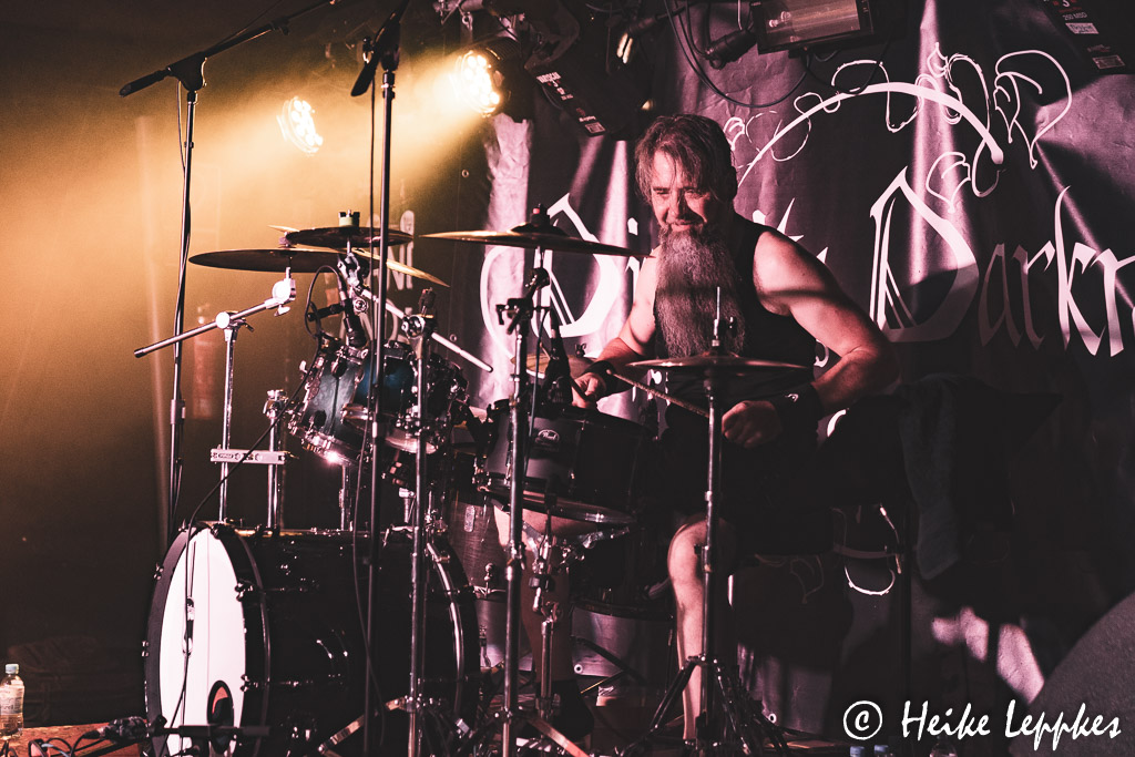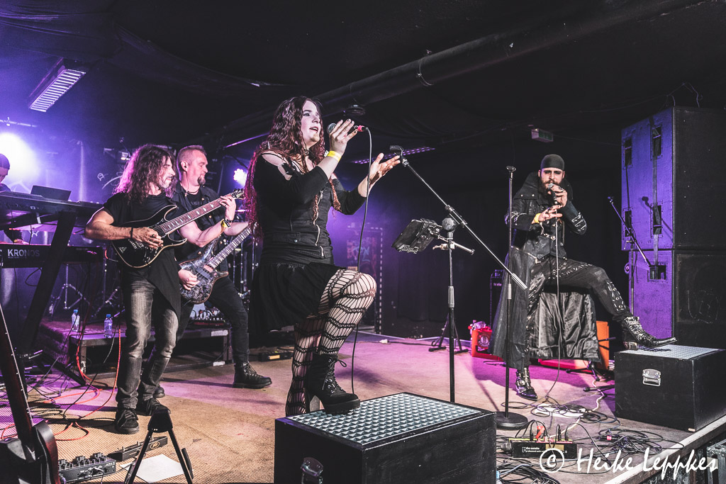Als Diversity Of Darkness fast pünktlich loslegen, ist das AZ dann tatsächlich sehr gut gefüllt. Ich bin ja zugegebenermaßen kein Gothic- bzw. Symphonic Metal-Fan, und so kann ich mit den ersten, ziemlich getragenen Songs nicht so wirklich viel anfangen. Aber die Wuppertaler Band hat in den sechs Jahren, die es sie mittlerweile gibt, gelernt, wie man auch Skeptikerinnen wie mich um den kleinen Finger wickelt. Auch wenn sie heute ohne ihren zweiten Gitarristen auf der Bühne stehen müssen, der ins Krankenhaus musste, weil sich seine Erkältung doch extremer als gedacht entwickelt hat, können sie mit einem bombastischen Sound aufwarten. Das Duo Mélanin und Exile an den Mikros funktioniert prächtig, und ich bin zugegebenermaßen sehr angetan von dem glasklaren Gesang von Mélanin. Im teilweise dialogartigen Gesang mit Exile setzen seine Growls den sehr krassen Kontrast. Dann greift Mélanin zum ersten Mal zur Flöte, es wird etwas folkiger, und die Songs nehmen Schwung auf. Da wird nicht nur auf der Bühne ordentlich geheadbangt, auch im Publikum fliegen die Haare. Mit den Songs von der EP Darkrise aus Mai 2020 kann man die Setliste schon mal gut bestücken, aber die sechs haben natürlich noch mehr Pfeile im Köcher. So vergeht der erste Auftritt schon mal sehr kurzweilig.