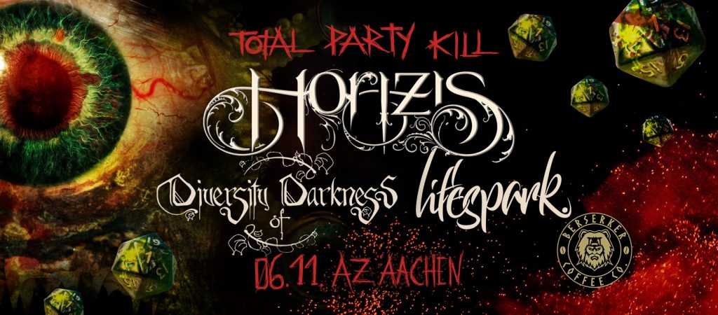 Über die neue Single Total Party Kill von Horizis hatten wir ja schon berichtet, und heute Abend wollen die Aachener Nerds nicht nur das AZ Aachen in eine Partymeile verwandeln. Eine After-Show-Party am gleichen Abend ist genauso geplant, wie ein Metalbrunch am nächsten Tag. Ich begnüge mich mit der Show im AZ und komme wie aufs Stichwort genau zu dem Zeitpunkt rein, als am Einlass mein Name genannt wird, denn Horizis waren so nett, mich einzuladen. Jetzt ist das AZ noch recht leer, aber das ändert sich ziemlich schnell. Abgesehen von der Show freue ich mich auch sehr, einen lieben Kollegen aus dem SYLB-Team kennenzulernen, denn Marcel spielt bei Lifespark den Bass.