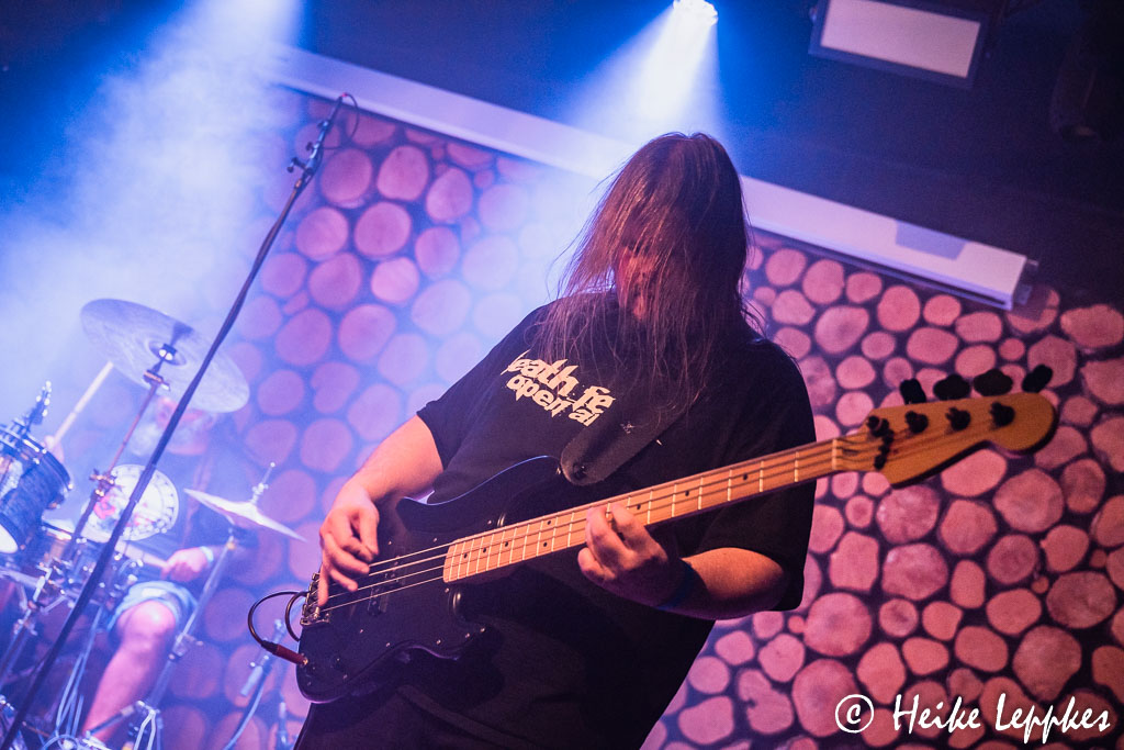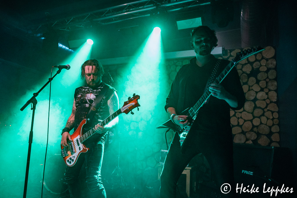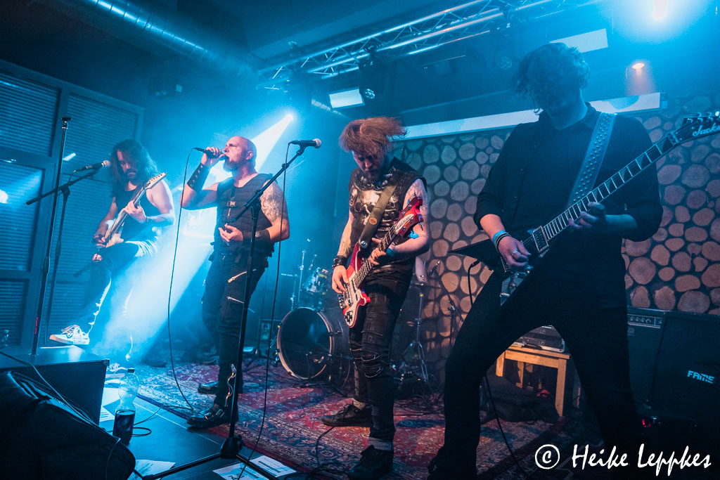 Danach geht’s dann aber wieder in die Richtung, für die heute wohl die meisten gekommen sind. Die Männer von Depraved Entity haben nicht ganz so viel Platz auf der Bühne wie die beiden vorangegangenen Trios, denn vorn müssen sich die drei Mann starke Saitenfraktion und Sänger David den Platz teilen. Aber das kriegen sie problemlos hin, da kann sich Simon, der erst im Februar dieses Jahres zur Band gestoßen ist, auch mal zu seinem Gitarrenkollegen Matthias und Bassist Tobi gesellen. Der größte Teil der Songs auf der Setliste stammt vom 2020er Album Queen Of The Night. Da wurde gerade noch einmal der Bestand an CDs aufgestockt, die jetzt im Jewelcase statt im Digipack erhältlich sind und natürlich auch heute am Merchstand erworben werden kann. Neben Tracks wie Steel My Heart, Dance With The Devil oder dem Song, der genauso heißt, wie die Band, gibt’s heute auch Strayers Destination auf die Ohren. Und immer wieder zeigt sich auch Hexe Jessie auf der Bühne, die einen blutverschmierten Schädel vor sich her trägt und mit Sänger David ein kurzes Ritual abhält. So geht’s mit Heavy Metal aus Hagen also sehr unterhaltsam weiter, wobei Depraved Entity ja tatsächlich schon die vorletzte Band ist.