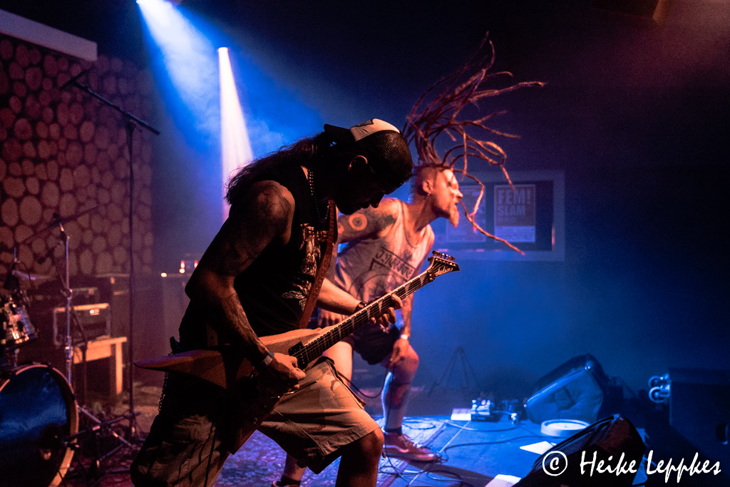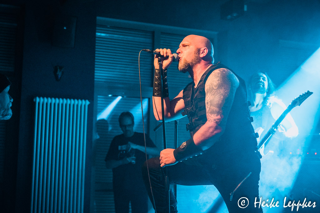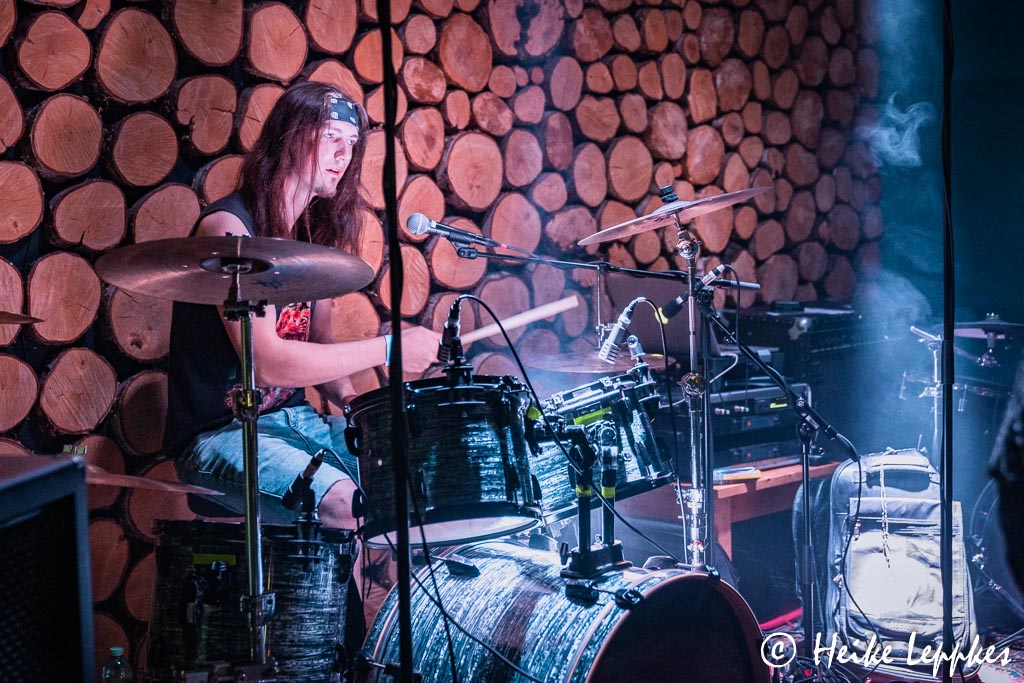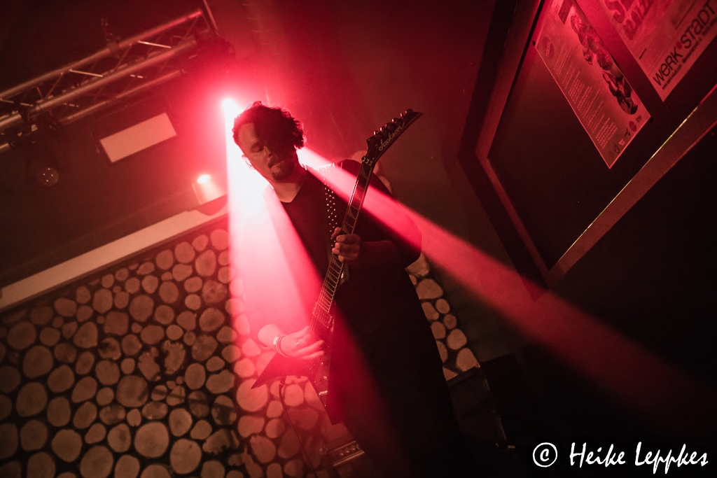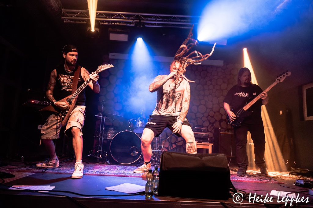 Und jetzt kommt die einzige Band, die ich schon kenne. Es ist ja noch gar nicht so lange her, dass ich Disminded beim musikalischen Frühschoppen im Krachgarten Wesel zum ersten Mal live erleben durfte. Am 15.05. standen sie dort auf der Bühne, und über diese Show haben wir natürlich auch berichtet. Aber es ist natürlich was anderes, eine Death/Thrash Band im strahlenden Sonnenschein oder hier im Stroboskop-Dauerfeuer zu sehen. Mir ist ja sowieso schon ziemlich warm geworden, aber bei der energiegeladenen Show des Quartetts komme ich jetzt endgültig ins Schwitzen. 😀 Hatten sie in Wesel als Intro noch Frère Jacque, kann ich heute nicht erkennen, was nicht nur den Jungs auf der Bühne ein Grinsen ins Gesicht tackert. Aber Metal ist es wieder mal nicht. Auch Disminded müssen heute übrigens auf ein Bandmitglied verzichten. Bei ihnen kommen die Drums aber nicht vom Band bzw. vom Laptop, sondern hinter den Drums hat ihr ehemaliger Schlagzeuger Pippo Platz genommen. Der hat sich extra für diese Show auch „geschminkt“ und nimmt die Lobesbekundungen dafür sehr gern entgegen. 😀 Die Songs My Own Way und Suffocate The Pain vom 2012er Demo und One Day oder Stomp vom 2015er Album Out Of The Ashes hat er ja noch selbst eingeprügelt, aber natürlich hat er sich auch Beheading The Snake vom gleichnamigen Album aus 2020 draufgeschafft. Ich befürchte ja fast, dass das Drumset unter seinem kraftvollen Spiel irgendwann zusammenbricht, aber auch diese Show, bei der es Sänger Kevin immer mal wieder ins Publikum zieht, unfallfrei über die Bühne.