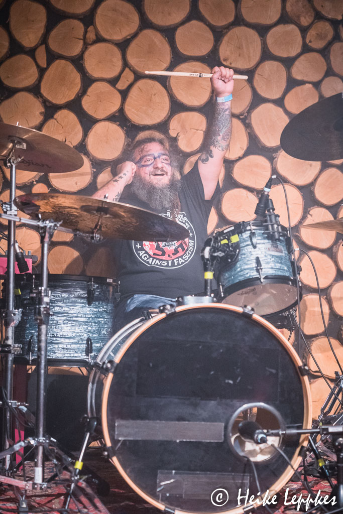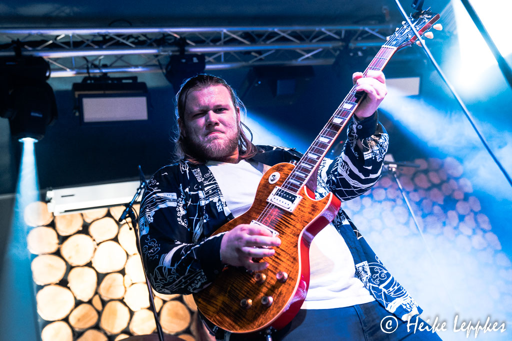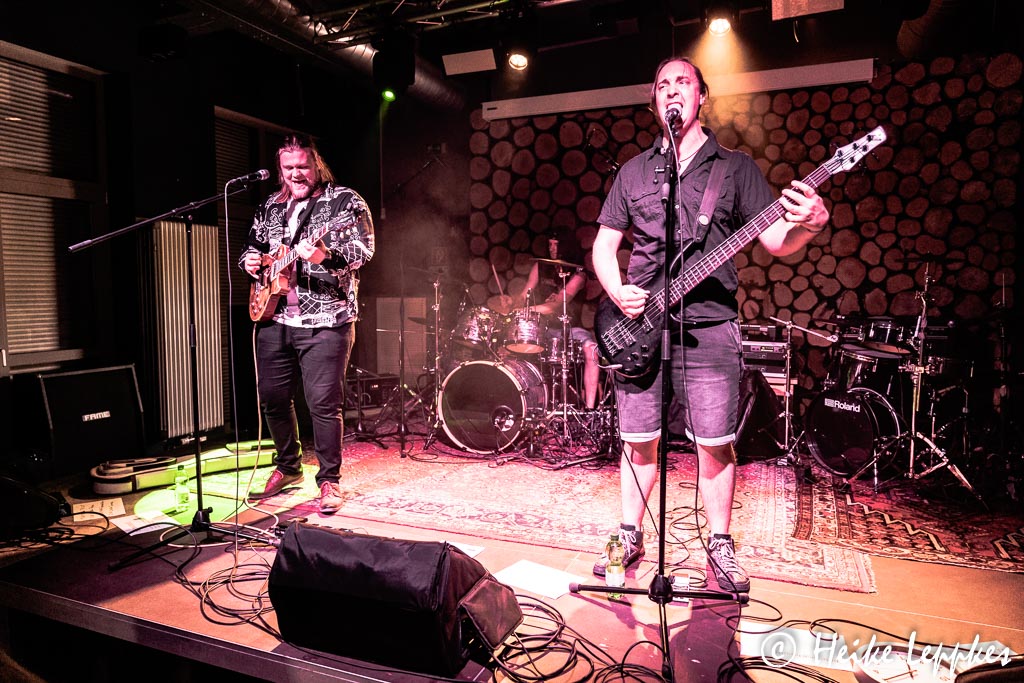 So geht es heute also mit der ersten Band los, die kurzfristig eingesprungen ist. Und so sehr ich es zunächst mal auch bedaure, dass jetzt weder Painata noch Rockwerk Orange auf der Bühne stehen, verstehen es die Jungs von P.O.I.N.T. ziemlich schnell, mein Bedauern auf ein sehr niedriges Level zu fahren. Performancetechnisch passiert da nicht allzu viel, aber was für einen ziemlich abgedrehten Progressive Metal die drei da präsentieren, verdient einen fetten Daumen hoch. Wenn ich mir aus der Nähe so anschaue, was die Saitenfraktion da anstellt, vom Drummer jetzt mal gar nicht zu reden, vergesse ich tatsächlich manchmal minutenlang das Fotografieren. Abgesehen davon sind sie auch mit einem klasse Sänger ausgestattet, der sogar die ultrahohen Töne auf den Punkt trifft. Hohe Töne sind beim letzten Track nicht nötig, aber dass die Jungs tatsächlich eine richtig geile Coverversion des 70er Jahre Discoklassikers Born To Be Alive (Patrick Hernandez) präsentieren, überrascht mich dann doch. Über die Jungs irgendwas rauszufinden, würde wahrscheinlich eine akribische Suche im Netz erfordern. Und so steht auf ihrer Bandcamp-Seite nur „We are P.O.I.N.T. We make Music. Period.“. Das lasse ich mal so stehen…