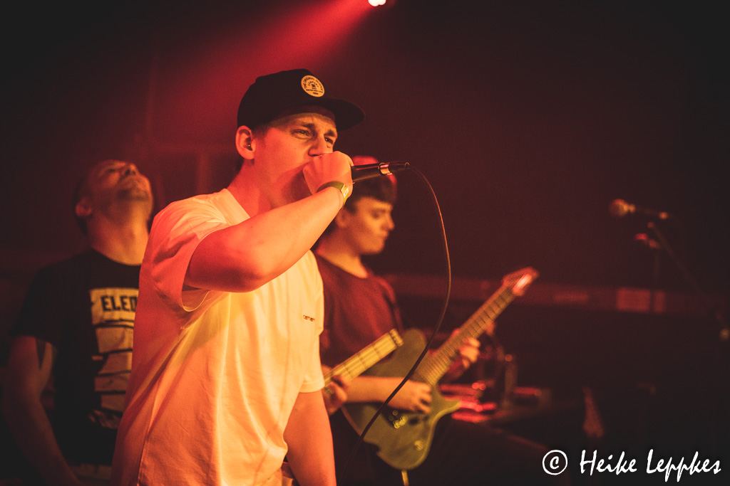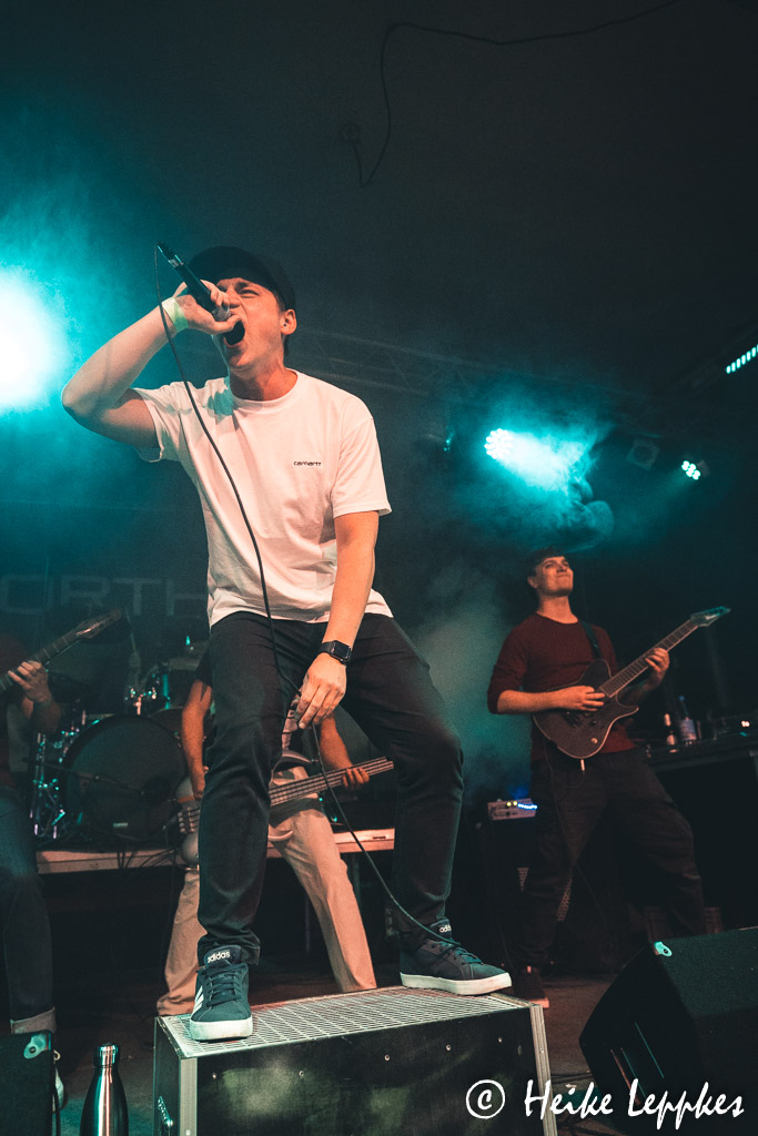 Von Ignore The Sirens hatte ich vorher noch nie was gehört. Genau wie bei Northern Light steht Düsseldorf als Homebase im Profil, aber viel mehr habe ich leider nicht herausfinden können. Auf BackstagePro gibt’s zwei Profile, die unterschiedliche Genres und auch unterschiedliche Gründungsjahre nennen, es wird wohl irgendwann in 2012 oder 2013 gewesen sein. Eine EP habe ich gefunden, nämlich Stay Aware aus 2020, und die fünf Songs, die sich darauf finden, stehen auch heute auf der Setliste. Aber Ignore The Sirens haben natürlich auch neuere Songs mitgebracht. Bei Back For Good muss ich zugegebenermaßen erstmal an den gleichnamigen Song von Take That denken, aber mit denen hat das Quintett natürlich nix am Hut. Sehr geilen Metalcore / Post Hardcore gibt’s jetzt vor den Latz geknallt, und genau wie Northern Light sind auch Ignore The Sirens mit einem großartigen Shouter ausgestattet. Der erzählt dann auch immer mal wieder, worum es in den Songs geht. Über pinkfarbene Einhörner oder Glücksbärchis singen Ignore The Sirens natürlich nicht, sondern über persönliche Erfahrungen und Gefühle, psychische Probleme oder einfach „nur“ das Lampenfieber, das die Jungs vor jedem Auftritt erfasst. Aber so ist das im Post Hardcore; da werden auch negative Empfindungen musikalisch sehr geil verpackt. Dass da die „Zugabe“-Rufe nicht lange auf sich warten lassen, verwundert nicht, und vollkommen „spontan“ kommen Ignore The Sirens dann noch mit zwei weiteren Tracks um die Ecke. Der letzte ist dann auch der älteste, und mit A Common Man endet diese sehr geile Show.