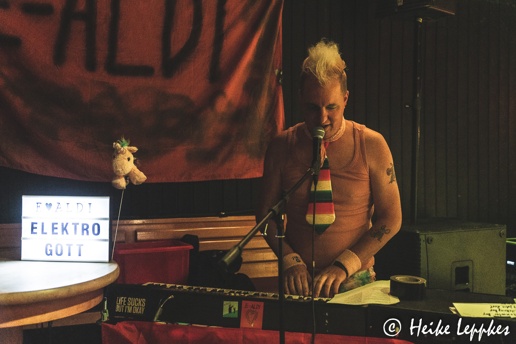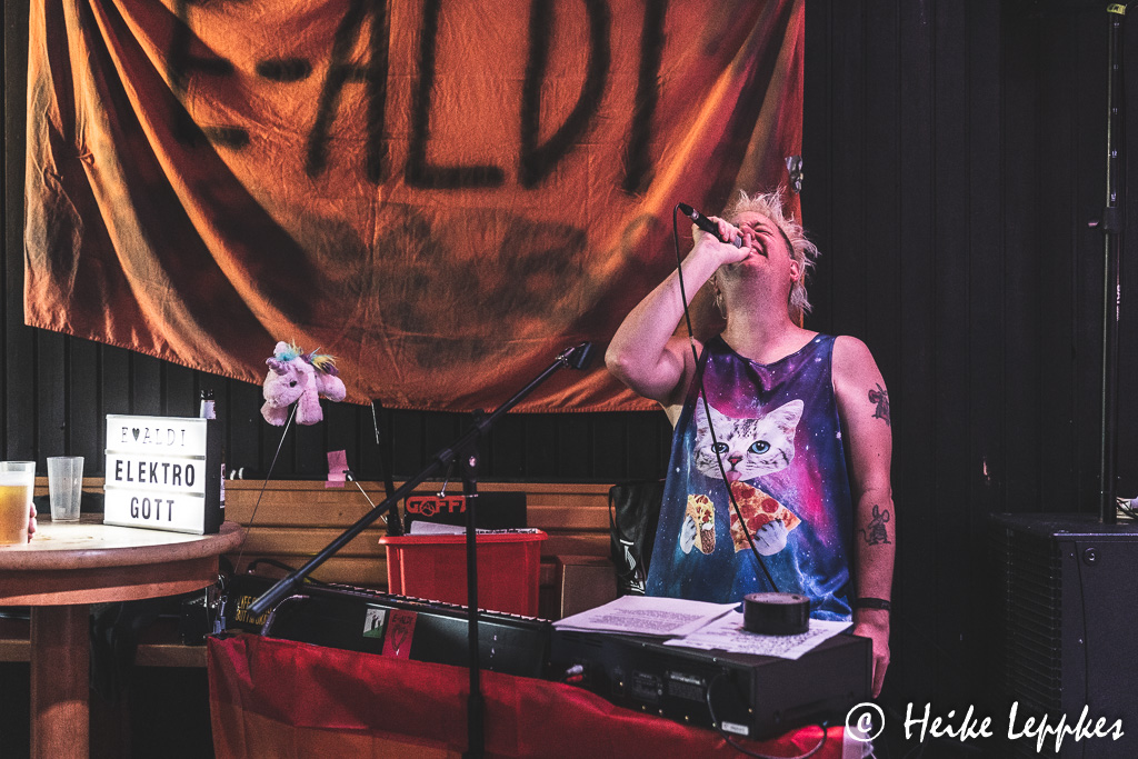 Neben den Bands ist auch heute wieder E Aldi am Start, der nicht nur jede Band ansagt, sondern auch jede Umbaupause mit seinen musikalischen Werken füllt. Da stehe ich dann manchmal genauso davor, wie ich es vor irgendwelchen Gemälden, Skulpturen oder Installationen aus der Moderne Kunst-Phase tue. 😀