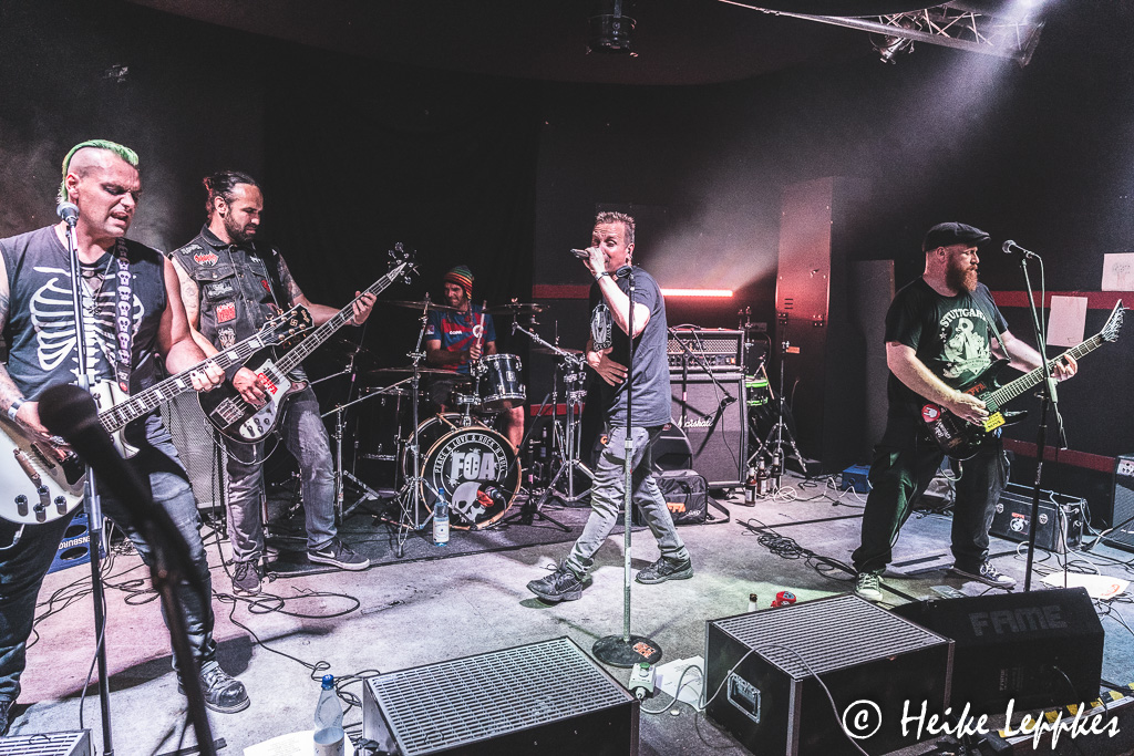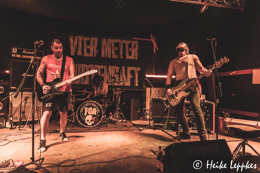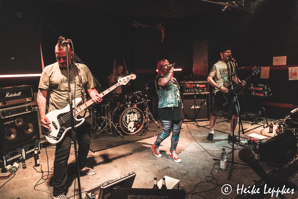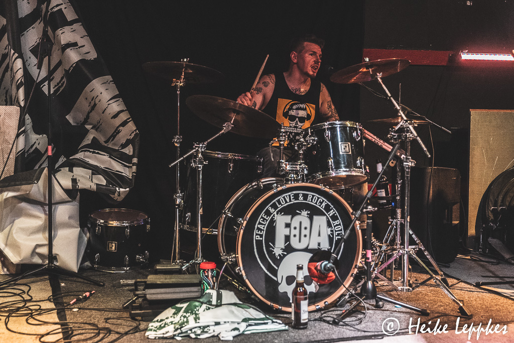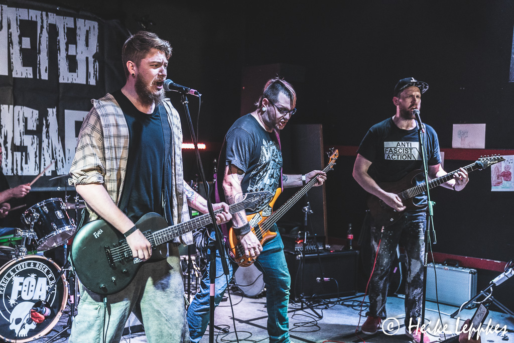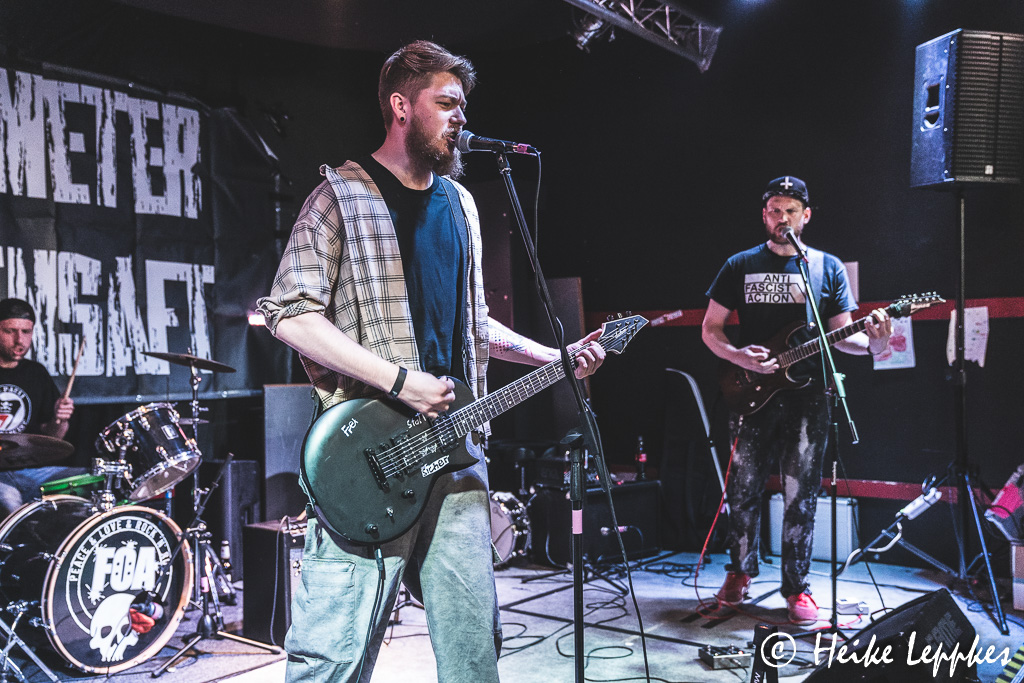 Hätte ich vor Ort schon gewusst, dass Frei Statt Sicher aus der Nähe meiner Heimatstadt kommen, nämlich aus Seesen in Niedersachsen, hätte ich sie gleich mal drauf angesprochen. Aber jetzt weiß ich auch, warum mir die etwas zurückhaltend erscheinende Art von Sänger/Gitarrist Simeon so vertraut erscheint. 😀 Medientechnisch sind sie sehr gut aufgestellt, und auf der Bandcamp-Seite findet sich natürlich auch das Debütalbum Sturmhaube Auf. Mit dem können sie ihre Setliste gut bestücken, denn das Album kommt mit 11 Tracks daher. So beziehen sie also mit Songs wie #wirsindmehr, Naziparteien oder Schein Oder Sein ganz klar Stellung zu Themen, die immer aktuell sind. Ein Song heißt auch genauso, wie die Band selbst, nämlich Frei Statt Sicher. So geht der zweite Tag also genauso geil los, wie der erste geendet hat.