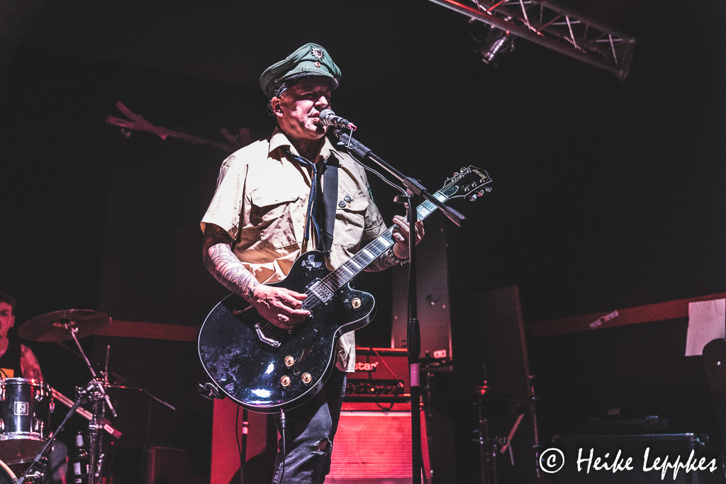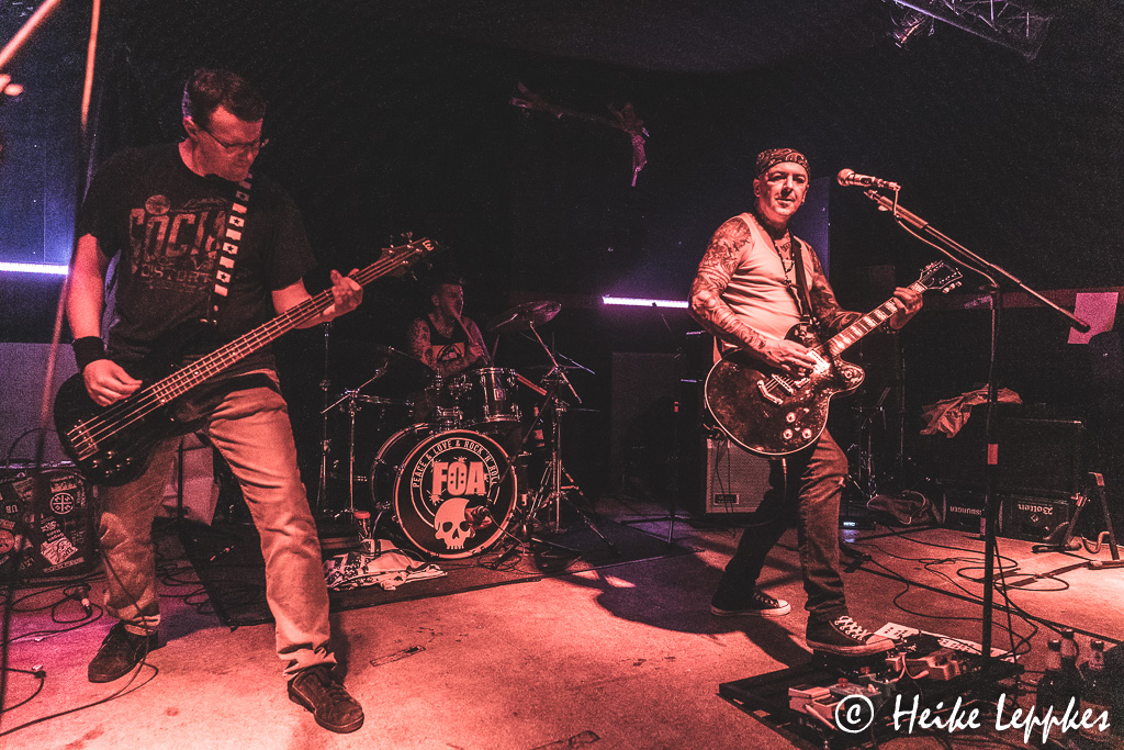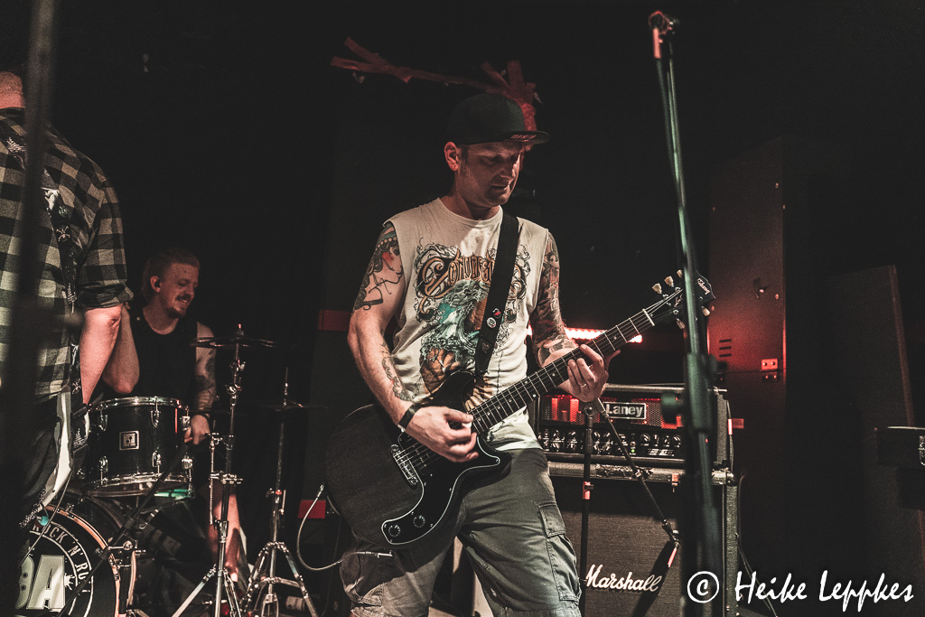 War die Stuttgarter Band Gaffa am ersten Tag die mit der längsten Anreise, ist das wohl heute Case39. Die sind nämlich aus Lübeck angereist. Ob der gleichnamige Psychothriller aus dem Jahr 2010 bei der Namensgebung im Jahr 2016 eine Rolle gespielt hat, weiß ich nicht. Bemerkenswert ist aber das erste Outfit von Sänger/Gitarrist Jörg, der mit einem Polizeihemd und einer passenden Mütze ausgestattet die Bühne betritt. Jetzt gibt’s auf jeden Fall noch einmal ordentlich was vor den Latz geballert, wobei der Punkrock von Case39 mit einem ordentlichen Schuss Rock’n’Roll daherkommt und mich teilweise tatsächlich ein wenig an Motörhead erinnert. Die Setliste von Case39 ist mächtig lang muss aber leider wegen des Zeitverzugs ordentlich eingekürzt werden. Aber bei Songs wie Shutdown In Hell, Anti Rockstar, Fucked Up Forever, Rockabilly Girl oder Darkness darf auch Drummer Matthias mal hinter seiner Schießbude hervorklettern und mit einer schönen Ballade beweisen, dass er nicht nur ordentlich auf die Felle und Becken knüppeln, sondern auch toll singen kann.