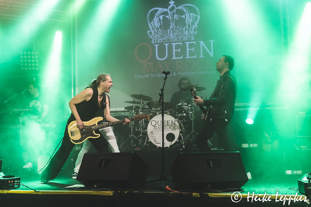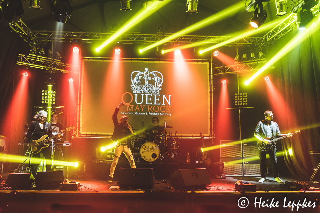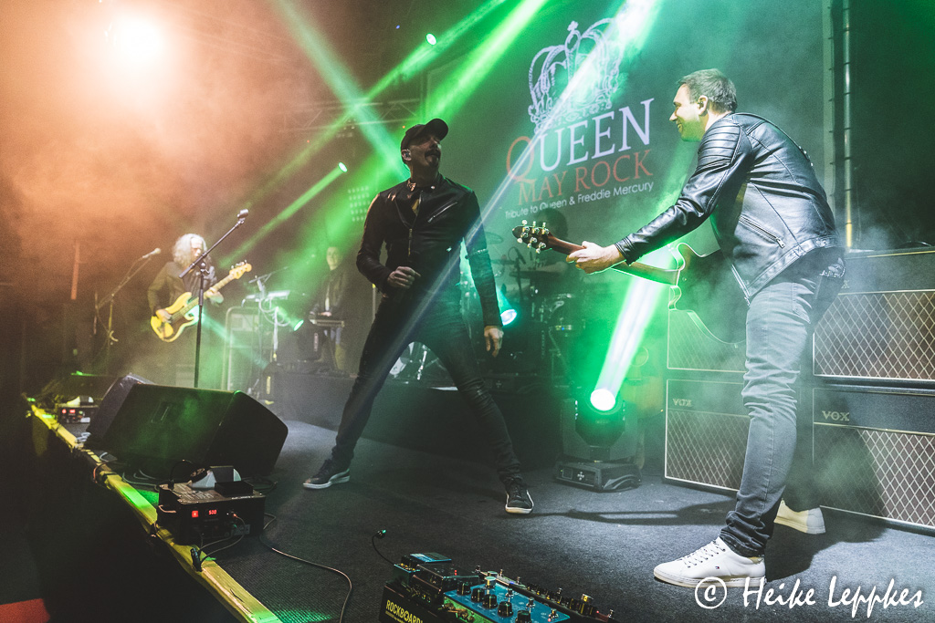 Bei Bounce (der Bon Jovi-Tributband) sieht deren Sänger dem (jungen) Original schon sehr ähnlich. Das ist bei Queen May Rock ein wenig anders, und auch stimmlich kommt Michael nicht ganz an Freddie Mercury (R.I.P.) ran. Gerade in den hohen Tönen muss er sich streckenweise zurücknehmen, wobei sich das insbesondere nach der Pause tatsächlich bessert. Das ändert aber nichts daran, dass man es den Männern ansieht, wie sehr sie sich freuen, endlich mal wieder eine Liveshow spielen zu können. Wie Michael erzählt, ist es die erste seit zwei Jahren, und gemeinsame Proben waren auch kaum machbar. Aber die Männer verstehen sich wortlos und haben sehr oft ein Lächeln auf die Lippen. Die gute Laune überträgt sich auch auf uns vor der Bühne und wird durch die kurzen launigen Ansagen von Michael noch verstärkt.