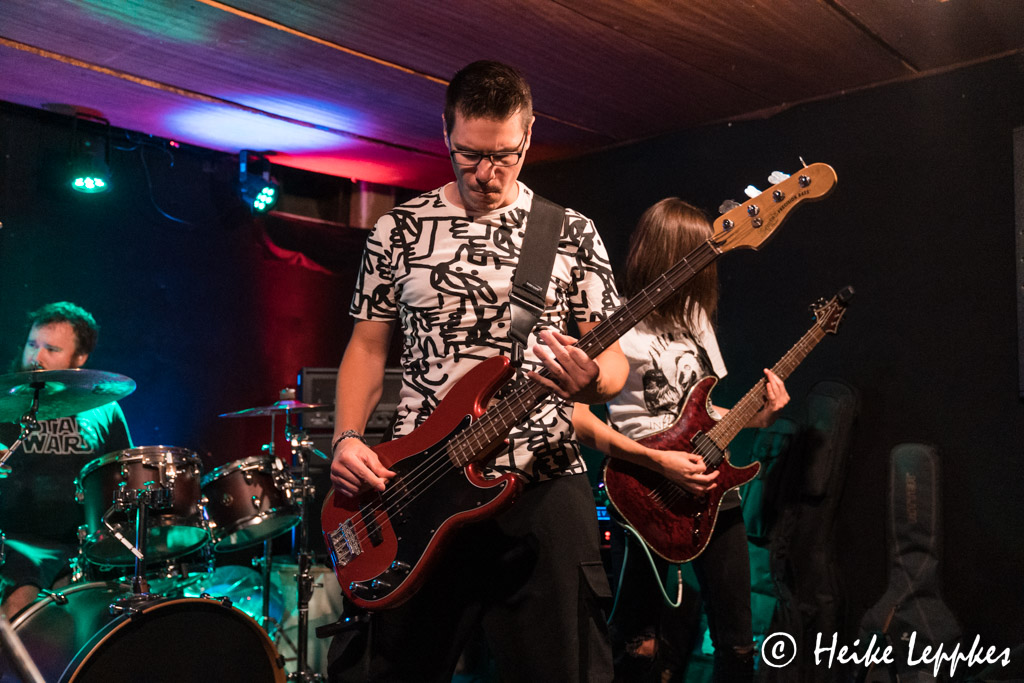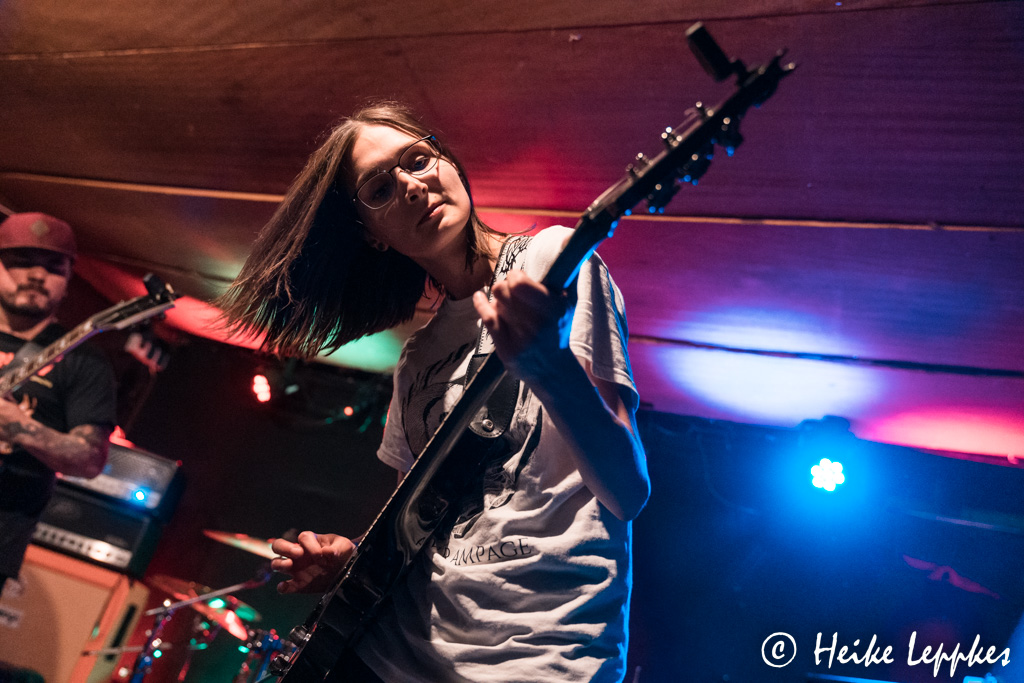 Die Band Rid Of The Sinners gibt’s tatsächlich schon seit dem Jahr 2017, und im März letzten Jahres haben sie ihre Debüt-EP Falling Empire veröffentlicht. In der jetzigen Besetzung ist es allerdings ihre erste Show, denn erst Ende Juli verkündeten sie, dass Patrick den Posten am Miko übernommen hat. Was mich persönlich sehr freut, ist, mit Caroline ein Mädel am Bass zu sehen. Auch Among Traitors verlassen sich mit Anja an der Gitarre auf Frauenpower. Und auch Martina, Sängerin von Burden To Atlas, sehe ich heute wieder. Die steht allerdings nicht auf, sondern heute mal vor der Bühne. Aber zurück zu Rid Of The Sinners.