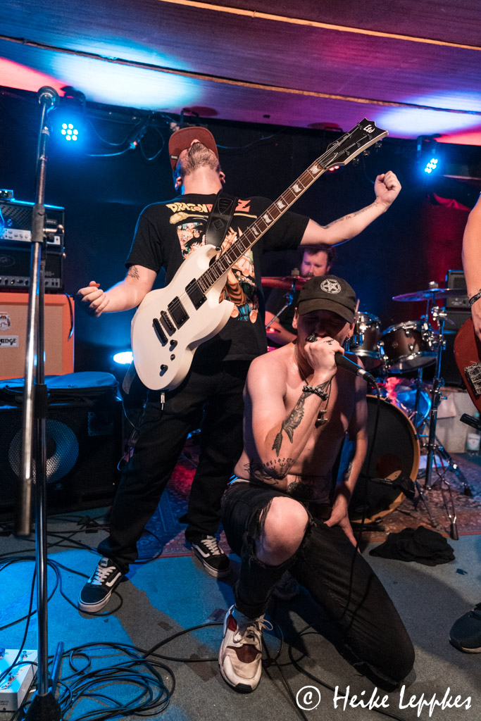 Musikalisch bin ich ein wenig hin- und hergerissen zwischen Melodic Death Metal und Metalcore, sie selbst ordnen sich im Modern Metal/Hardcore ein. Vom „Intro“ ihrer Debüt-EP abgesehen starten sie heute ihre Show mit dem ersten Track ebendieser EP und legen mit Playing God gleich mal die Messlatte ziemlich hoch. Hier habe ich kurz die Gelegenheit, mich zum Fotografieren vor der Bühne aufzubauen, das kann ich für den Rest des Abends vergessen, denn da tobt die Menge. 😀 Auch Falling Empire, Hunting Me und End Of The Line stammen von der Debüt-EP. Aber auf der ruhen sich Rid Of The Sinners natürlich nicht aus. Und so können sie ihre Setliste mit So What?!, System und Hells Gate komplettieren. Sänger Patrick hält es von Anfang an nicht auf der Bühne, er steht teilweise Auge in Auge mit den Gästen in der vorderen Reihe. Einige von denen erweisen sich als sehr textsicher, was augenscheinlich nicht nur Patrick freut. Der weiß anscheinend ganz genau, wem er das Mikro vor die Nase halten muss, denn der junge Mann, der den Gesang übernimmt, ist entweder schon Sänger oder sollte es dringend werden, denn er liefert sehr geile Growls. Ich freue mich nicht erst jetzt, dass ich mich heute für diese Show entschieden habe, denn Rid Of The Sinners liefern eine klasse Show und dürfen sich unter wohlverdientem lautem Applaus verabschieden.