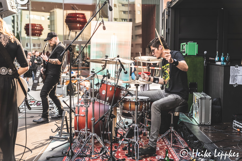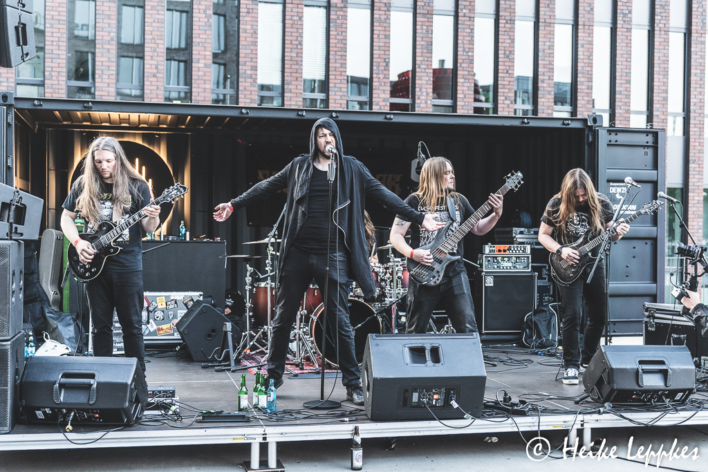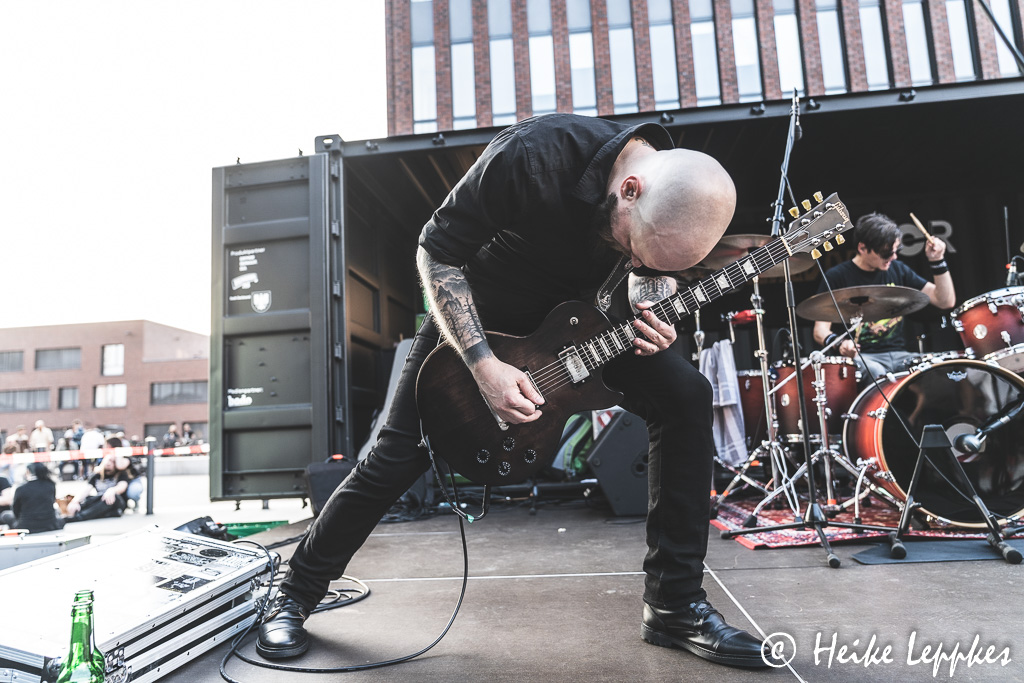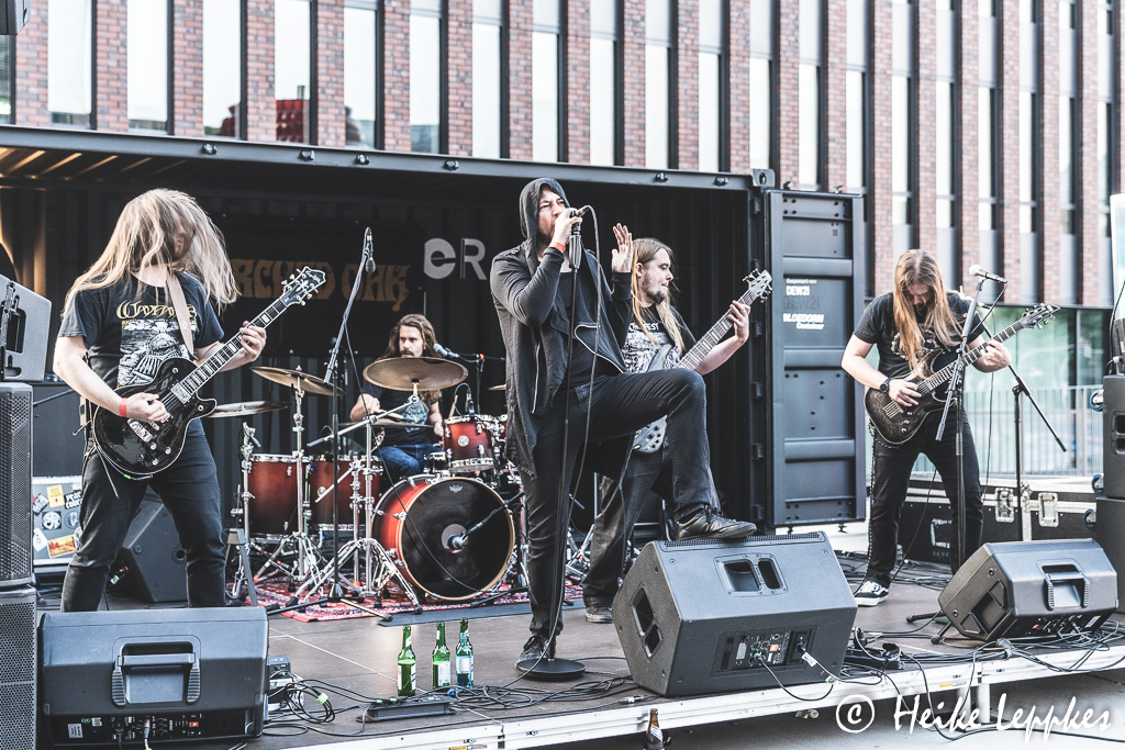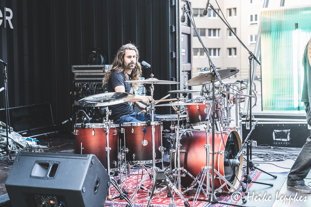 So langsam geht es erfreulicherweise wieder los mit Shows. Aktuell finden diese bevorzugt draußen statt, aber bei dem schönen Wetter ist das ja überhaupt kein Problem. Also am 09.07. auf nach Dortmund. Das Parkhaus direkt neben dem Dortmunder U ruft zwar ziemlich hohe Preise auf, aber dafür ist man direkt an dem Gelände, wo heute zwei Bands auf der Bühne stehen, die genretechnisch nicht wirklich auf einer Wellenlänge liegen. Das tut dem Interesse aber keinen Abbruch, und so haben sich schon eine halbe Stunde vor Showbeginn mehr als nur eine Handvoll Menschen eingefunden. Die meisten bleiben außerhalb des mit schicken Absperrbändern markierten Geländes stehen, aber viele gönnen sich doch den Luxus, sich nach Registrierung auf einem der zahlreichen Strandliegestühlen niederzulassen.