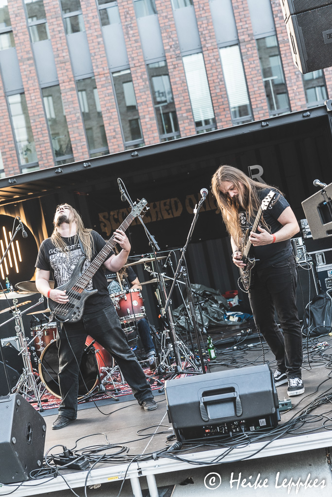 Los geht es mit Scorched Oak, die heute Heimspiel haben. Gegründet im Jahr 2016 konnten die drei schon bei vielen Shows mit ihrem satten Stoner Rock, dem sie gern auch einen Schuss Heavy Rock und einige Doom Elemente beifügen, überzeugen. Auch ich habe sie schon mehrmals live erleben dürfen und bin immer wieder begeistert von den drei unterschiedlichen Charakteren, die da auf der Bühne stehen. Im September vergangenen Jahres haben sie ihr Album Withering Earth veröffentlicht, das zwar „nur“ mit fünf Songs daherkommt, aber trotzdem an der 50-Minuten-Marke kratzt. Songs von Scorched Oak sind ja mindestens sieben, gern aber auch mal 12 Minuten lang. Zunächst einmal ergibt sich heute aber gleich zu Beginn der Show eine Zwangspause, denn eine Sicherung aus dem Gitarrenverstärker quittiert ihren Dienst. So wird also zügig umgestöpselt, und dann legen die drei eine großartige Show hin, bei der man allen ansieht, wie froh sie sind, endlich mal wieder vor Publikum spielen zu können. Das betont auch Linda des Öfteren, wenn sie nicht gerade wie ein Wirbelwind mit ihrer Bassgitarre über die Bühne tanzt. Den vielstimmigen Ruf nach einer Zugabe können Scorched Oak nicht erfüllen, der Zeitplan ist eng, und Außerwelt machen sich schon bereit.