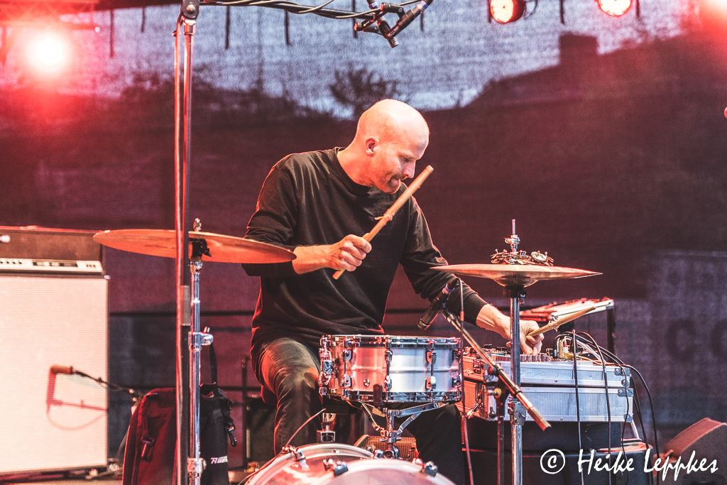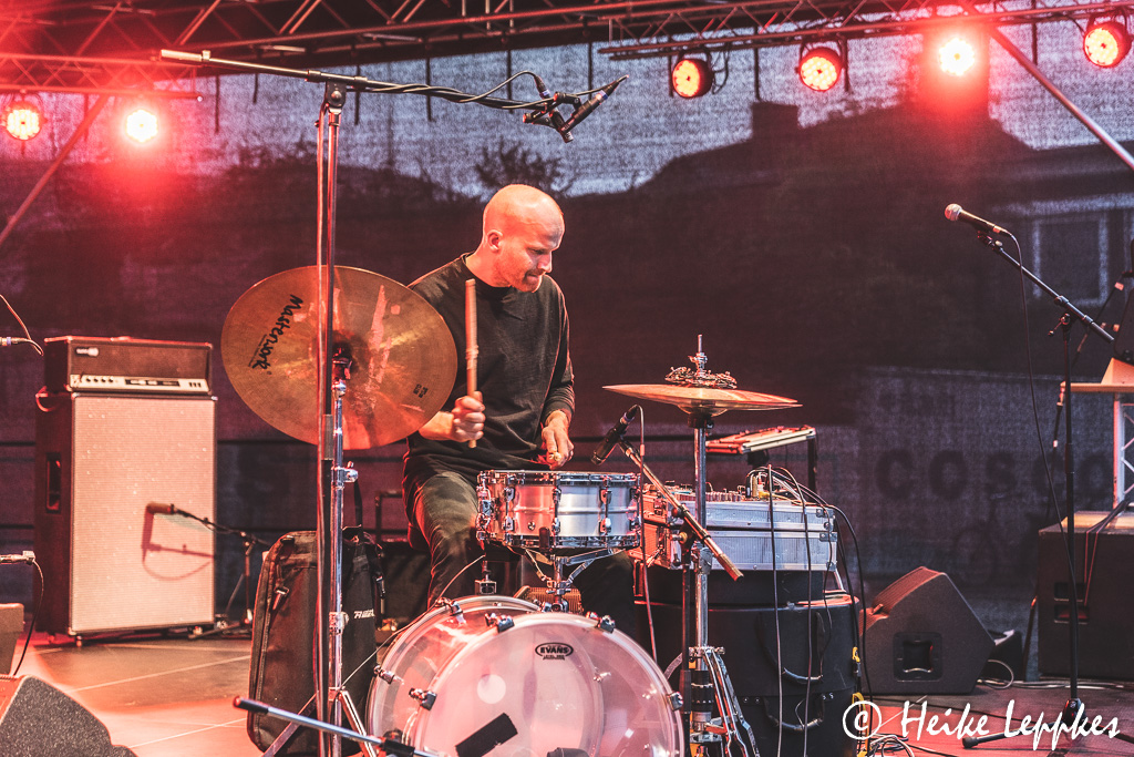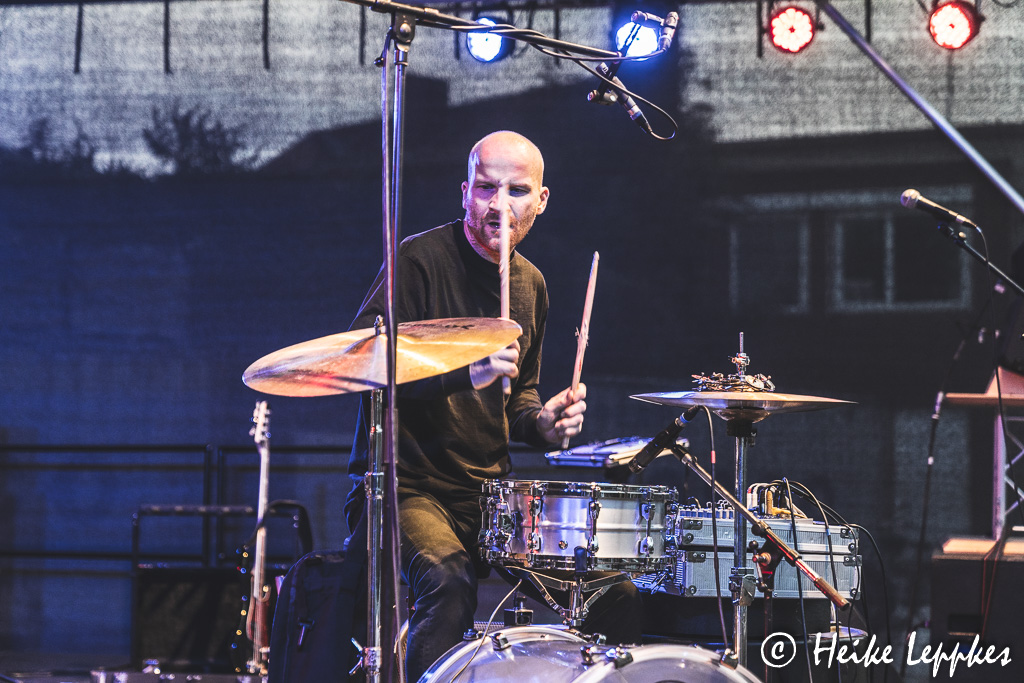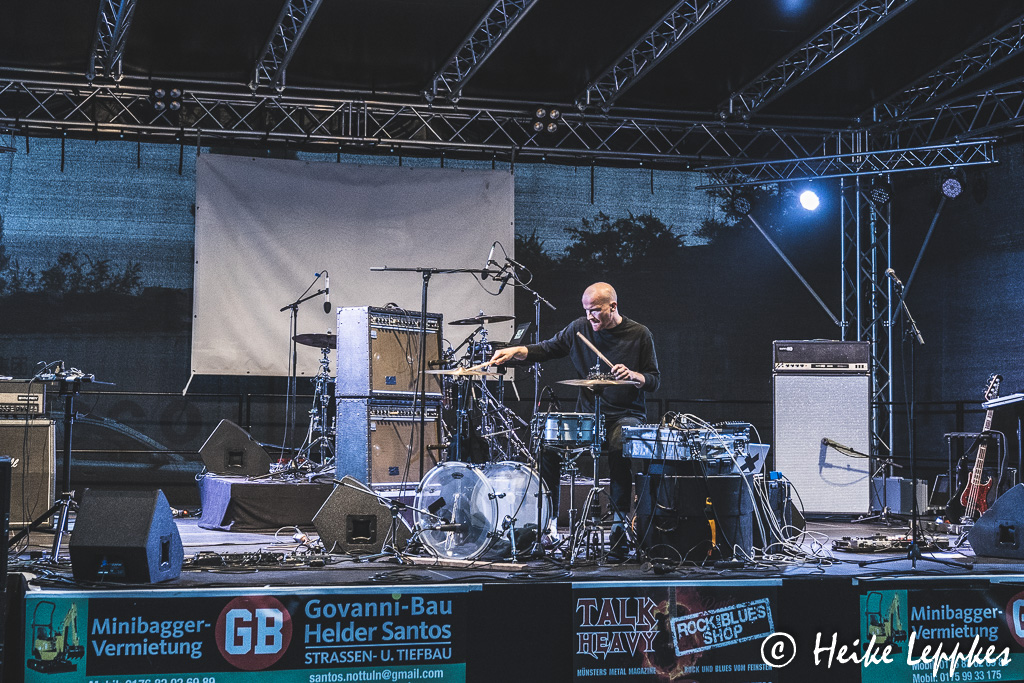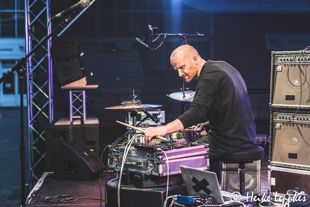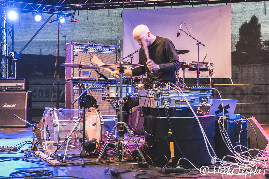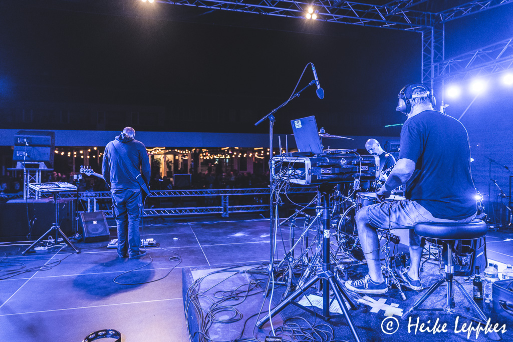 Nach etwas über zwei Stunden Fahrzeit komme ich also am Jovel an. Die Männer von Suntrigger haben den Soundcheck schon hinter sich, da ist Zeit für nette Gespräche mit Marcel, Till und Oliver. Das letzte Mal, dass die drei auf der Bühne standen, ist tatsächlich schon fast zwei Jahre her. Umso mehr freuen sie sich, heute Outdoor auf dieser schönen Bühne spielen zu können. Für die Gäste sind kleine Sitzgruppen aufgebaut, da kann man es sich gemütlich machen. Auch der Supportact Exchampion ist natürlich schon vor Ort. Den Namen hatte ich vorher noch nie gehört und bin auch ziemlich überrascht, dass es sich um einen Solokünstler handelt. Aber allein die Tatsache, dass er mit einem Schlagzeug arbeitet, weckt in mir schon mal die Vorfreude. Das Drumset spielt allerdings gar nicht mal die Hauptrolle, denn Exchampion spielt auch sehr gern mit elektronischen Elementen und dreht eigentlich mehr an irgendwelchen Reglern, als dass er die Drumsticks schwingt. Sehr unterhaltsam, und eine sehr kurzweilige Show. Das finden auch die Zuschauer. Den Rufen nach einer Zugabe muss Exchampion allerdings freundlich eine Absage erteilen, und das sind auch die einzigen Worte, die er heute macht.