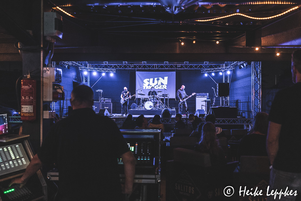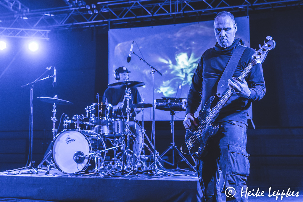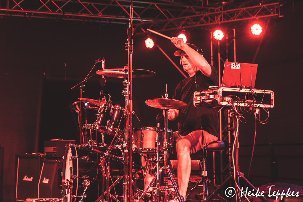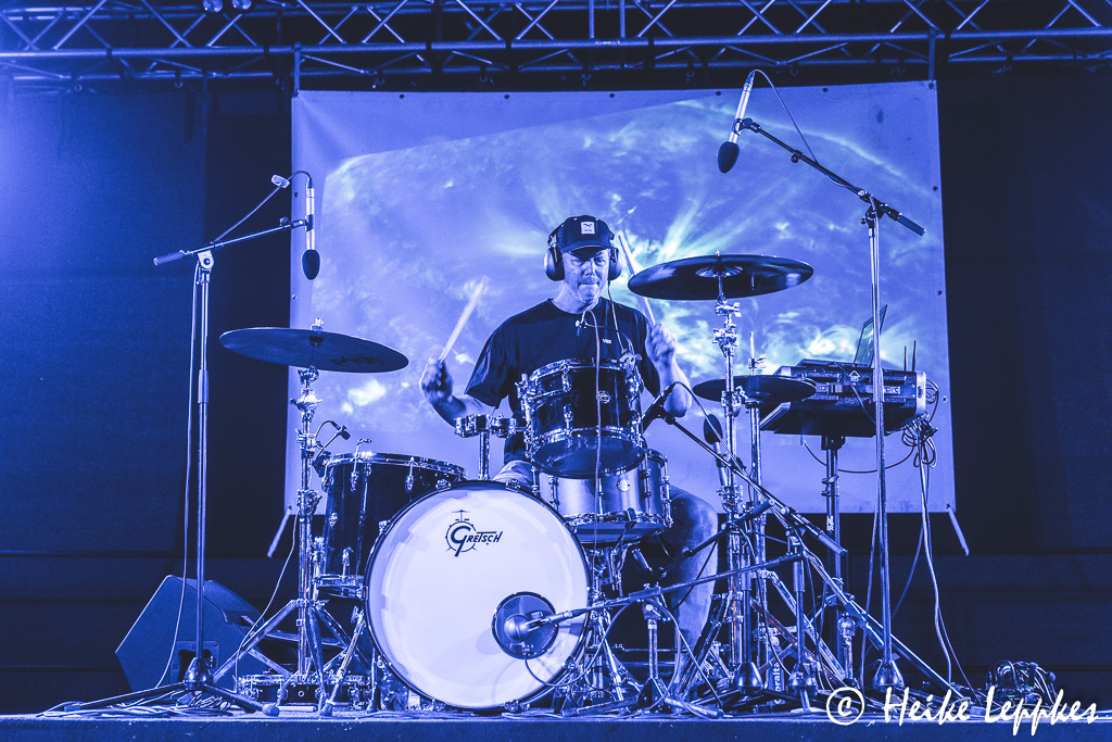 Da es mittlerweile doch sehr kühl geworden ist, hole ich mir in der Umbaupause meinen Hoodie aus dem Auto. Marcel ist da allerdings ziemlich schmerzbefreit und rennt weiter in Bermudashorts und T-Shirt durch die Gegend. Er wird sich aber gleich an den Drums warm spielen, und ich bin sehr gespannt, ob es auch heute wieder ein Schlagzeugsolo geben wird. Was es natürlich wieder gibt, sind die Einspieler auf der Leinwand hinter Marcel. Die kurzen Filme oder visuellen Effekte passen wie A… auf Eimer zu den Songs von Suntrigger und lenken den Blick das eine oder andere Mal von den Jungs weg auf die Leinwand. Aber so ein audiovisuelles Gesamtpaket ist schon was Feines, die Männer von Suntrigger sind nämlich nicht auf Effekthascherei oder irgendwelches Posing aus, sondern lassen ihre Songs sprechen. Die kann man sich auf den beiden Alben Interstellar aus 2017 und Liquid Times aus 2020 anhören. Im April letzten Jahres wurde noch das Album Instant Live (Lockdown Session 2020) veröffentlicht. Dafür hatten sich die Männer von Suntrigger in ihrem Proberaum getroffen und unter Coronabedingungen ihre Lieblingssongs der beiden Alben neu eingespielt, und zwar live und ohne Overdubs. Diese Lieblingssongs haben auch heute den Weg auf die Setliste gefunden, und los geht es mit dem Song, der so heißt, wie die Band (oder ist es umgekehrt?). Wie immer bei Shows von Suntrigger greift Oliver ab und zu mal zum Mikro. Aber nicht, um zu singen, sondern den nächsten Song anzusagen. Und „natürlich“ gibt es auch heute wieder ein Schlagzeugsolo, das seinen Platz irgendwo zwischen Unbreakable, Crossing The Horizon oder Liquid Time findet. Nach acht Songs ist dann erstmal Schluss. Das klingt wenig, aber wenn man überlegt, dass Instant Live aus dem vergangenen Jahr mit 11 Tracks auf insgesamt knapp 67 Minuten kommt, kann man sich ungefähr ausrechnen, wie lang ein Song von Suntrigger sein kann. Von den „Zugabe“-Rufen lassen sich Marcel, Oliver und Till noch einmal auf die Bühne locken. Jetzt gibt’s den letzten Track des ersten Albums, Interstellar, direkt gefolgt vom ersten Track des zweiten Albums, Beyond Interstellar. Aber die Gäste haben immer noch nicht genug. So servieren dann Suntrigger sozusagen als Nachtisch noch Lost. Dann ist wirklich Feierabend, aber in Hektik verfällt hier niemand, denn hier am Jovel kann man es wirklich sehr gut aushalten.