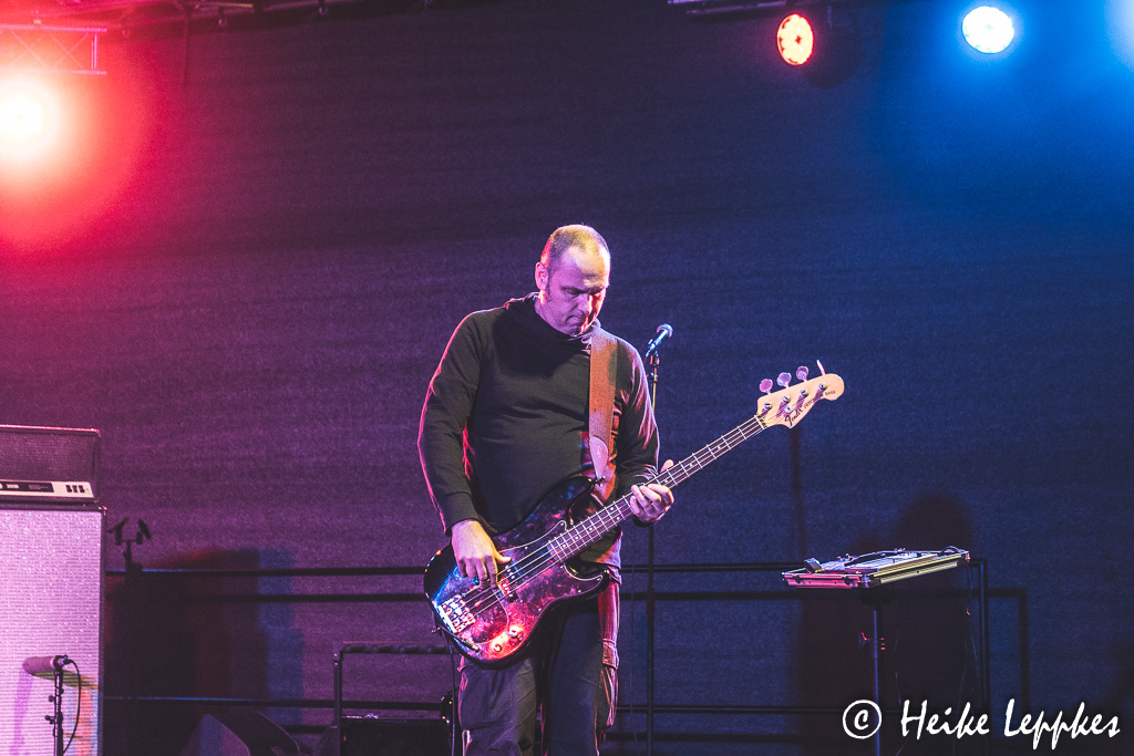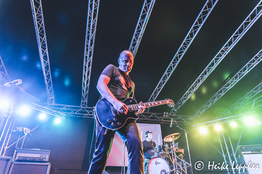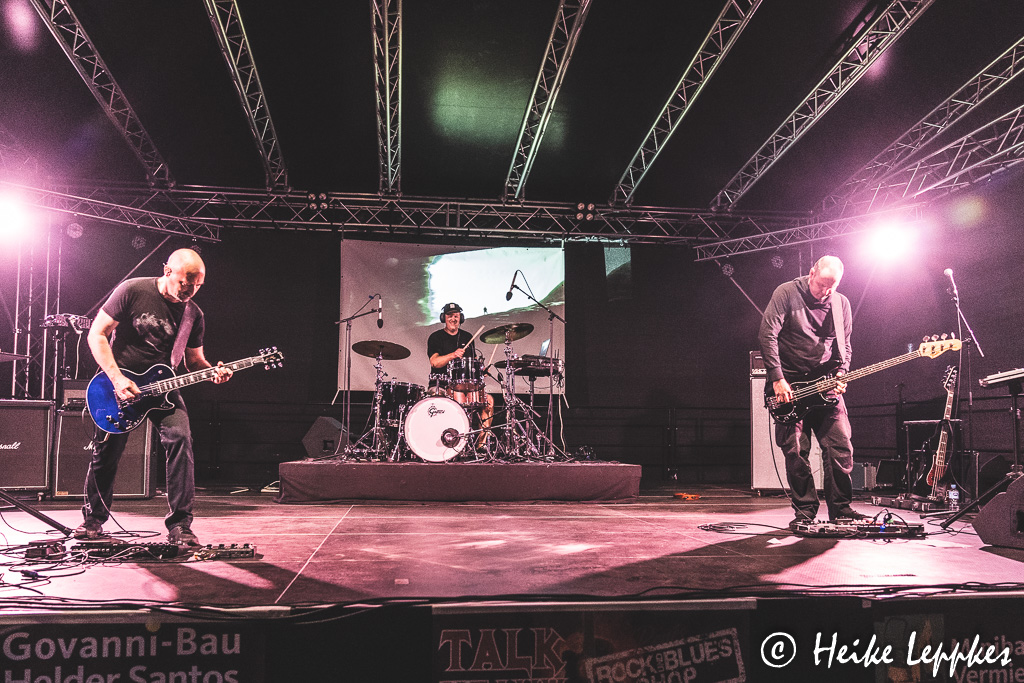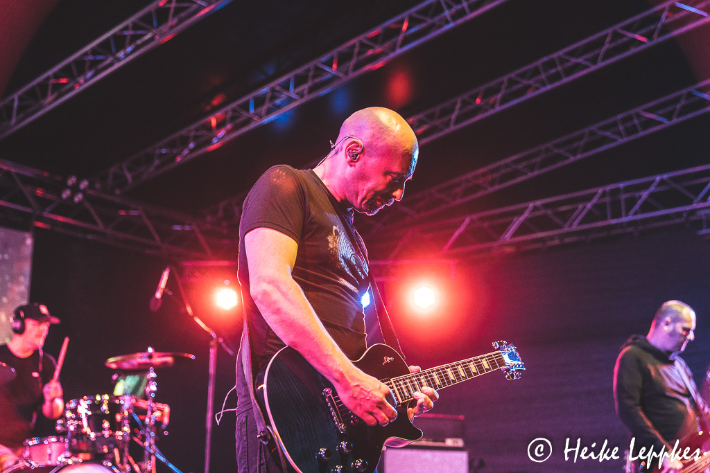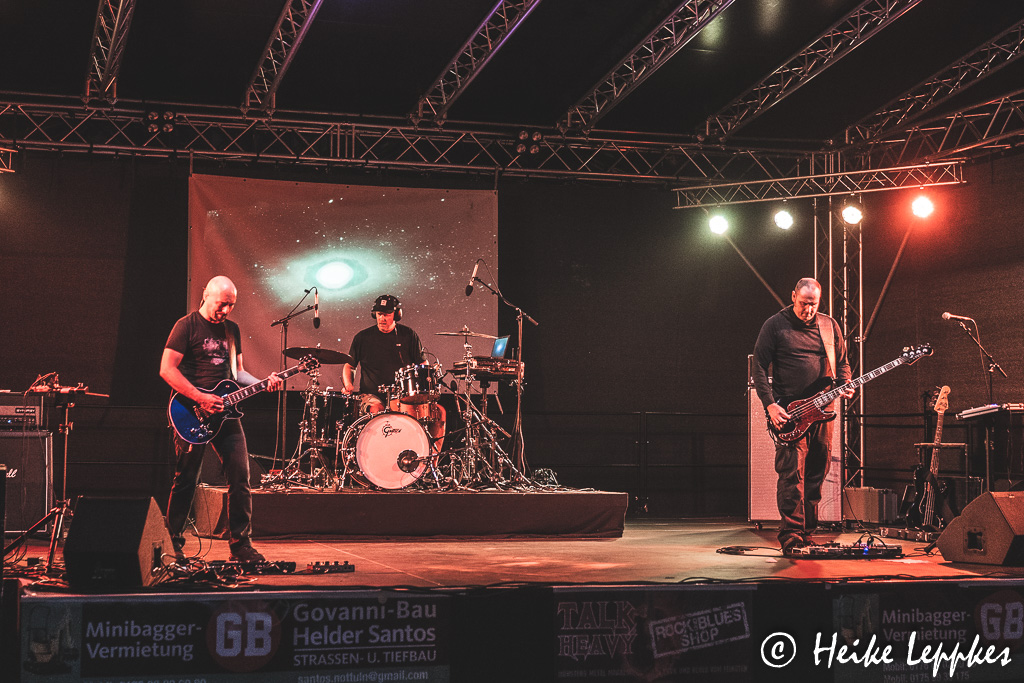 Da es mittlerweile doch sehr kühl geworden ist, hole ich mir in der Umbaupause meinen Hoodie aus dem Auto. Marcel ist da allerdings ziemlich schmerzbefreit und rennt weiter in Bermudashorts und T-Shirt durch die Gegend. Er wird sich aber gleich an den Drums warm spielen, und ich bin sehr gespannt, ob es auch heute wieder ein Schlagzeugsolo geben wird. Was es natürlich wieder gibt, sind die Einspieler auf der Leinwand hinter Marcel. Die kurzen Filme oder visuellen Effekte passen wie A… auf Eimer zu den Songs von Suntrigger und lenken den Blick das eine oder andere Mal von den Jungs weg auf die Leinwand. Aber so ein audiovisuelles Gesamtpaket ist schon was Feines, die Männer von Suntrigger sind nämlich nicht auf Effekthascherei oder irgendwelches Posing aus, sondern lassen ihre Songs sprechen. Die kann man sich auf den beiden Alben Interstellar aus 2017 und Liquid Times aus 2020 anhören. Im April letzten Jahres wurde noch das Album Instant Live (Lockdown Session 2020) veröffentlicht. Dafür hatten sich die Männer von Suntrigger in ihrem Proberaum getroffen und unter Coronabedingungen ihre Lieblingssongs der beiden Alben neu eingespielt, und zwar live und ohne Overdubs. Diese Lieblingssongs haben auch heute den Weg auf die Setliste gefunden, und los geht es mit dem Song, der so heißt, wie die Band (oder ist es umgekehrt?). Wie immer bei Shows von Suntrigger greift Oliver ab und zu mal zum Mikro. Aber nicht, um zu singen, sondern den nächsten Song anzusagen. Und „natürlich“ gibt es auch heute wieder ein Schlagzeugsolo, das seinen Platz irgendwo zwischen Unbreakable, Crossing The Horizon oder Liquid Time findet. Nach acht Songs ist dann erstmal Schluss. Das klingt wenig, aber wenn man überlegt, dass Instant Live aus dem vergangenen Jahr mit 11 Tracks auf insgesamt knapp 67 Minuten kommt, kann man sich ungefähr ausrechnen, wie lang ein Song von Suntrigger sein kann. Von den „Zugabe“-Rufen lassen sich Marcel, Oliver und Till noch einmal auf die Bühne locken. Jetzt gibt’s den letzten Track des ersten Albums, Interstellar, direkt gefolgt vom ersten Track des zweiten Albums, Beyond Interstellar. Aber die Gäste haben immer noch nicht genug. So servieren dann Suntrigger sozusagen als Nachtisch noch Lost. Dann ist wirklich Feierabend, aber in Hektik verfällt hier niemand, denn hier am Jovel kann man es wirklich sehr gut aushalten.
